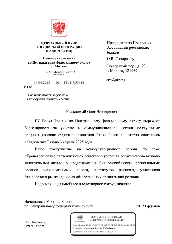 Главное Управление Банка России по Центральному федеральному округу направило в адрес Ассоциации российских банков письмо, в котором поблагодарило АРБ за участие в коммуникационной сессии «Актуальные вопросы денежно-кредитной политики Банка России». Мероприятие состоялась в Отделении Рязань 3 апреля 2025 года. В письме отмечено, что выступление Председателя правления АРБ Олега Скворцова по теме «Трансграничные платежи: поиск решений в условиях ограничений» вызвало значительный интерес у представителей бизнес-сообщества, региональных органов исполнительной власти, институтов развития, участников финансового рынка, деловых общественных организаций региона.