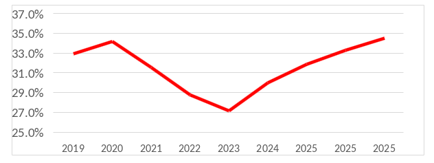 Доля средств физических лиц составила 34,6%, что является максимальным значением начиная с 2019 года В первом квартале 2025 года произошло существенное увеличение розничного индекса АРБ на 1 процентный пункт до 26,23%, несмотря на стагнацию розничного кредитного портфеля благодаря снижению суммарных активов банковского сектора (снижение по МБК и кредитам юрлицам). По итогам первого полугодия розничный индекс существенно увеличился по сравнению с началом года на 1,58 процентных пункта. Это максимальное значение с 2020 года, несмотря на практические нулевой прирост розничного кредитования благодаря росту средств населения на счетах при одновременном сокращении активов банковской системы в целом. Об этом говорится в новом исследовании, которое подготовили аналитики Ассоциации российских банков. В исследовании также говорится, что, достигнув максимального значения к концу 2019 года (27,14%), розничный индекс на протяжении 2020-2023 годов снижался и на начало 2024 года составил 25,08%, фактически вернувшись к уровню начала 2019 года. Основной причиной здесь стало значительное сокращение удельного веса средств физлиц в пассивах в последние 4 года, вызванное, в том числе, значительным оттоком валютных средств граждан. Доля валютных сбережений населения за прошлый год сократилась с 8,4 до 6,8%, за первый квартал текущего года сократилась с 6,8 до 5,6%, а по итогам первого полугодия сократилась до 5,2%. По итогам прошлого года розничный индекс составил 25,25% и можно констатировать, что тренд на снижение индекса на протяжении 2020-23 годов поменялся на повышательный в 2024 году.