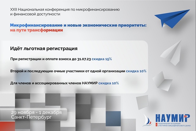 Национальная ассоциация участников микрофинансового рынка НАУМИР приглашает вас принять участие в XXII Национальной конференции по микрофинансированию и финансовой доступности, которая будет проходить в городе Санкт-Петербург с 29 ноября по 1 декабря. Тема конференции - "Микрофинансирование и новые экономические приоритеты: на пути трансформации". Данное мероприятие ежегодно становится важнейшей площадкой для большинства участников микрофинансового рынка для обсуждения злободневных тем и поиска решений, символом подведения итогов и построения планов на завтрашний день. Обращаем ваше внимание на льготные условия регистрации. При регистрации и оплате взноса до 31 июля 2023 года, вы получаете скидку в размере 15%! Кроме того, вы можете воспользоваться специальной скидкой для второго и последующих очных участников от одной организации. При регистрации нескольких участников скидка составит 10%. Для членов и ассоциированных членов НАУМИР действует скидка в размере 10%. Также мы предлагаем феноменальную скидку до 25% при регистрации до 31 июля 2023 года. Мы ценим каждого! Поэтому, ждем вас 29 ноября в Санкт-Петербурге на трехдневном марафоне, который поможет определить новые экономические приоритеты. Не упустите шанс быть частью преобразований в микрофинансировании и экономическом развитии! Авторизуйтесь, чтобы оставить комментарий. |