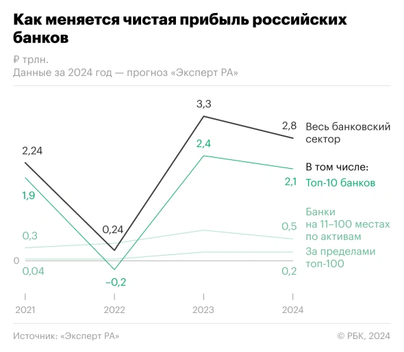 Российские банки в 2024 году не смогут обновить рекорд по чистой прибыли и заработают около 2,8 трлн руб., говорится в прогнозе рейтингового агентства «Эксперт РА» (есть у РБК). По сравнению с успешным для сектора прошлым годом финансовый результат сократится на 13% (с 3,3 трлн руб.), этот спад аналитики охарактеризовали как период «после золотой лихорадки». «Это был невероятный успех, скорее кладезь доходов, который иссяк, как и золотые рудники», — говорит директор по банковским рейтингам агентства «Эксперт РА» Ксения Якушкина. Почему рекорд 2023 года повторить не удастся Как следует из расчетов «Эксперт РА», в 2023 году крупнейшие игроки из топ-10 по активам заработали 2,4 трлн руб. (73% результата всего сектора), а остальные банки в пределах первой сотни — 0,7 трлн руб., причем участники рынка меньшего размера практически удвоили объем чистой прибыли 2022 года. «Отсутствие внешних ограничений для многих банков в этой категории в течение большей части 2023 года создало для них конкурентные преимущества в сфере обслуживания внешнеэкономической деятельности (ВЭД)», — указывают аналитики.