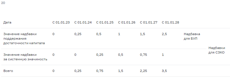 - временное обнуление требований по надбавкам к нормативам достаточности капитала банков с 2023 года с их последующим постепенным восстановлением в течение 5 лет (включая грейс-период в 1 год)20. Вне зависимости от соблюдения указанных временных надбавок банки смогут выплачивать вознаграждение своему менеджменту для сохранения его мотивации к быстрому восстановлению финансовой устойчивости КО.