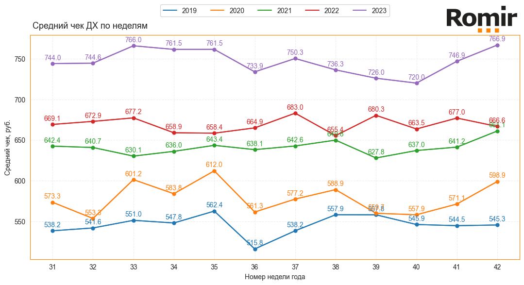 Согласно Единой панели данных Ромир, средний чек на одну покупку в среднестатистическом российском домохозяйстве на прошедшей 42 неделе 2023 года (с 16 октября по 22 октября) составил 766,9 руб., что на 2,7% больше, чем неделей ранее. Таким образом, после трехнедельного периода снижения (с 38 по 40 неделю) средний чек показывает рост уже вторую неделю подряд. По сравнению с аналогичной неделей прошлого года средний чек вырос на 100 руб. или на 15%. В целом, стоит отметить, что сейчас величина среднего чека за одну покупку находится на максимальной отметке за последние три месяца. Близкие к нынешнему значения фиксировались в августе текущего года. Вероятно, рост размера среднего чека можно объяснить подорожанием некоторых позиций в потребительской корзине. Объем недельных расходов растет пропорционально величине чека, что свидетельствует о том, что изменений в потребительском поведении россиян не произошло. Источник: Единая панель данных (Romir Consumer Scan Panel), октябрь 2023 ИНСЧ (индекс недельного среднего чека) показывает динамику стоимости покупок домохозяйств. Единая панель данных (Romir Consumer Scan Panel) – это уникальная технологическая разработка Ромир, благодаря которой компания собирает и анализирует данные о покупках домохозяйств и отдельных потребителей. Исследование охватывает более 40 000 потребителей в более чем 220 городах России с населением более 10 000 человек. Выборка панели репрезентирует все население России. Авторизуйтесь, чтобы оставить комментарий. |