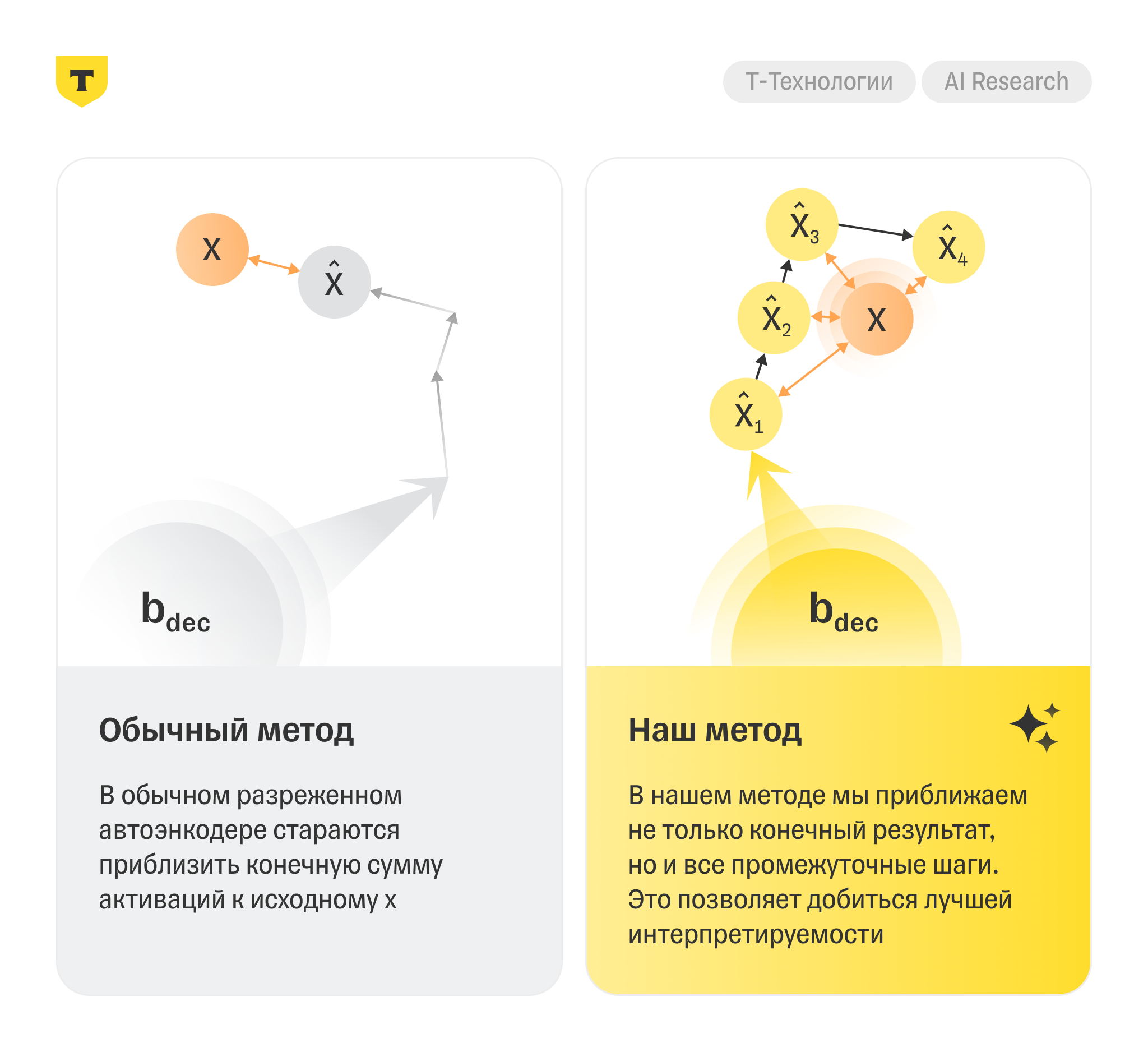 Исследователи из T-Bank AI Research разработали метод HierarchicalTopK, который делает работу нейросетей прозрачнее. Обычно, чтобы объяснить решения модели, исследователи переводят ее внутренние сигналы в «человеческие» признаки. Но здесь возникает конфликт: чем больше признаков, тем точнее описание, но тем сложнее их понять; чем меньше — тем понятнее, но теряются детали. Новый метод позволяет сохранить интерпретируемость на разных уровнях детализации без потери качества. Результаты были представлены на одной из ведущих международных конференций в области ИИ по эмпирическим методам обработки естественного языка (EMNLP 2025) уровня, А*, которая проходила с 4 по 9 ноября в Сучжоу, Китай. Суть открытия Современные языковые модели сложны для анализа: их внутренние механизмы плохо поддаются интерпретации. Существующие подходы используют sparse autoencoders (разреженные автоэнкодеры) — это особый вид нейросетей, которые помогают понять, что происходит «внутри» больших моделей. Они преобразуют активации модели в набор «человеческих» концептов. Но у этого метода есть ограничение: разреженность (уровень детализации) нужно выбрать заранее и каждая настройка требует обучения отдельной модели. Исследователи T-Bank AI Research предложили метод HierarchicalTopK, который позволяет обучать систему так, чтобы она могла объяснять свои решения сразу на разных уровнях подробности. То есть теперь не нужно создавать несколько отдельных моделей под каждую задачу — достаточно одной универсальной, которая одинаково хорошо справляется и с простыми объяснениями, и с более детальным разбором.