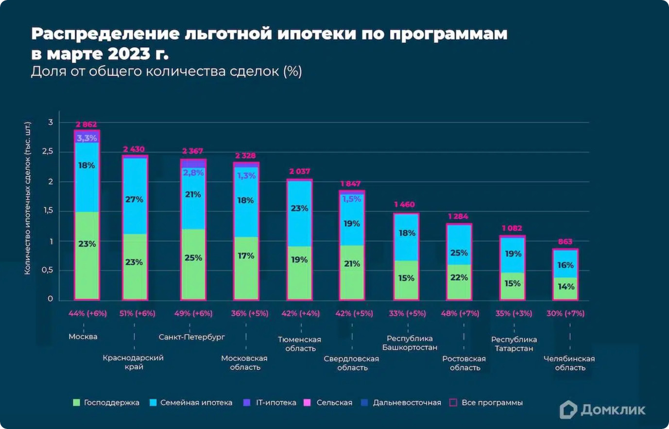 Количество выданных кредитов по льготным программам в марте 2023 года (топ-10 регионов по количеству выдач). Количество сделок по программе «Господдержка» и доля выдач относительно общего количества ипотек за месяц показана зелёным, количество сделок и доля выдач по семейной ипотеке — синим, по ИТ-ипотеке — фиолетовым, по сельской ипотеке — розовым. Данные отсортированы по суммарному количеству сделок по всем льготным программам. Самой востребованной по-прежнему остаётся программа «Семейная ипотека». Её доля в общем количестве выдач в марте 2023 года составила 17% (в феврале было 16%). В Сбере «Семейную ипотеку» можно оформить по ставке от 5,3% на строительство жилого дома и от 5,7% — на покупку дома или квартиры в новостройке. Кредит предоставляется семьям с одним ребёнком, который родился после 1 января 2018 года, с двумя и более детьми младше 18 лет, а также семьям, в которых есть ребёнок с инвалидностью, рождённый не позднее 31 декабря 2023 года. Программа «Господдержка» также остаётся высоко востребованной на российском рынке, но всё-таки в меньшей степени: доля выдач — 16% (в феврале было 13%). При этом в Москве и Санкт-Петербурге «Семейная ипотека» уступает программе «Господдержка», разрыв составляет 4−5%. Смягчение условий кредитования ИТ-специалистов в начале 2023 года привело к росту доли ИТ-ипотеки: в марте процент выдач увеличился до 1%, а объём превысил 7,6 млрд рублей (новый рекорд за всё время действия программы). Наибольший спрос наблюдается в Москве (3,3% от всех выдач), Санкт-Петербурге (2,8%) и Московской области (1,3%). Источник: http://www.sberbank.ru/ru/sberpress/all/article?newsID=ee1b3b43-46e1-432d-b02f-cd6de6cec...