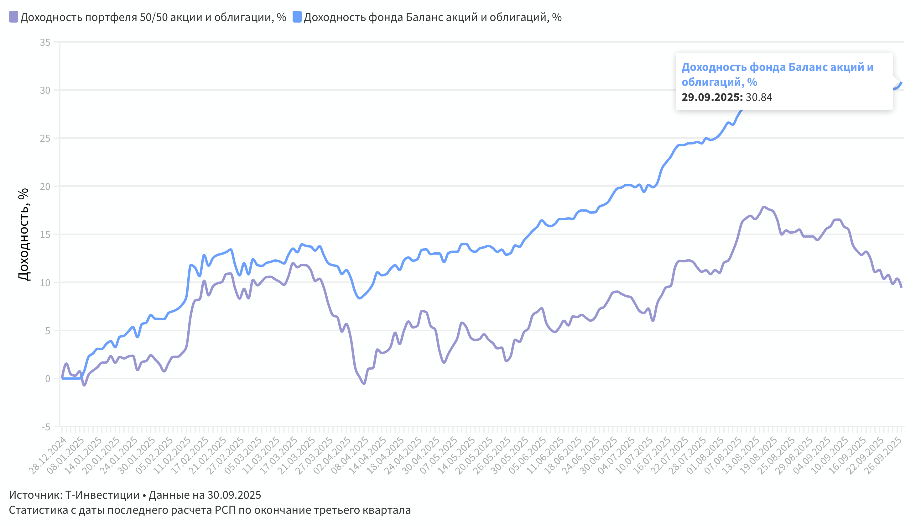 Управляющая компания «Т-Капитал» подвела итоги деятельности фондов за девять месяцев 2025 года. Медианная доходность фондов с учетом комиссий составила 16,85%. Отдельные стратегии показали рост до +30,8%, опередив ключевые рыночные индексы. Несмотря на волатильность рынка, 11 фондов компании показали положительную динамику, что говорит об эффективности управления. Результат фонда «Баланс акций и облигаций» в сравнении с портфелем из 50% акций и 50% облигаций оказался выше на 21,4%. Результат с конца 2024 года (последняя дата расчета РСП) по 30 сентября 2025 (конец третьего квартала):