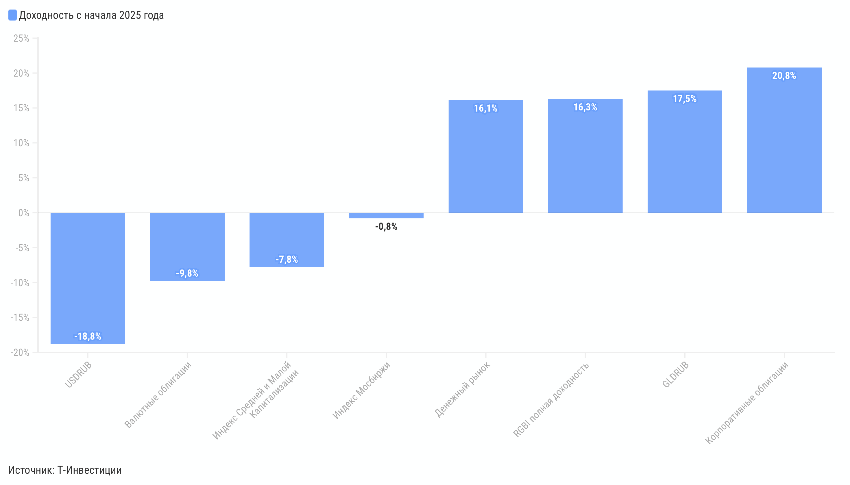Лучшую доходность с начала года инвесторам принесли смешанные фонды, а также фонды на облигации и золото. Стоит выделить фонд «Баланс акций и облигаций» с доходностью 30,8% в 2025 году, который активно управляет аллокацией между акциями, облигациями и золотом. В сентябре лучшим стал фонд «Золото» (TGLD), показавший рост на 14,2%, следуя за динамикой цен на драгоценный металл. Результаты фондов Т-Капитала соответствуют доходности рыночных индексов на аналогичные классы активов, а в случае некоторых фондов существенно опережают их. В этом году рост на 16–20% показывают денежный рынок, ОФЗ (индекс RGBITR), золото и корпоративные облигации. Если смотреть на акции, доходность индекса Мосбиржи с учетом дивидендов (MCFTR) в 2025-м пока близка к нулю, а доллар и валютные облигации демонстрируют отрицательную динамику на фоне укрепления рубля.