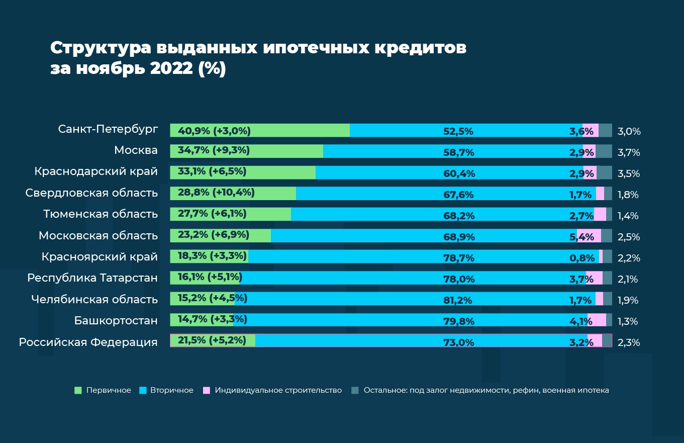 Распределение ипотеки по типам кредитов для топ-10 регионов по количеству выдач в ноябре 2022 года: приобретение первичного и вторичного жилья (обозначены как «Первичное» и «Вторичное» соответственно), индивидуальное строительство. «Остальное» включает в себя нецелевые кредиты под залог недвижимости, рефинансирование, военную ипотеку. Данные отсортированы по доле сделок по покупке первичной недвижимости в общем объеме выдач. Красным выделено распределение сделок по типам кредитов для всей России. Напомним, что в октябре аналитики зафиксировали перетекание спроса с первичного рынка на вторичный. По мнению аналитиков Домклик, причина значительного изменения структуры ипотеки заключалась, прежде всего, в притоке выгодных предложений на вторичном рынке: число желающих продать квартиру намного превышало количество тех, кто был готов ее купить, поэтому продавцы активнее шли на уступки в пользу высокой скорости сделки. Однако в ноябре ситуация изменилась в противоположную сторону — статистика по крупнейшим регионам показывает равномерное увеличение спроса на первичную недвижимость. Во всех выделенных регионах доля сделок на первичном рынке увеличилась на 3–10%. Больше всего этот показатель вырос в Свердловской области (+10,4%), Москве (+9,3%) и Московской области (+6,9%). Близкое значение прироста доли сделок фиксируется по всей стране — на 5%. "Мы полагаем, что заметное увеличение покупательской активности на первичном рынке — явление краткосрочное и вызвано прежде всего объявлением о возможной отмене программы господдержки и разговорами об сворачивании ипотеки с околонулевыми ставками. После решения о продлении программы льготной ипотеки до середины 2024 года мы ожидаем, что перетекание спроса на вторичный рынок вновь наберет обороты." - Мария Ромчанова, руководитель аналитического центра дивизиона «Домклик» Сбербанка. Источник: https://www.sberbank.ru/ru/sberpress/analitika_issledovaniya/article?newsID=08dc30d7-12c...