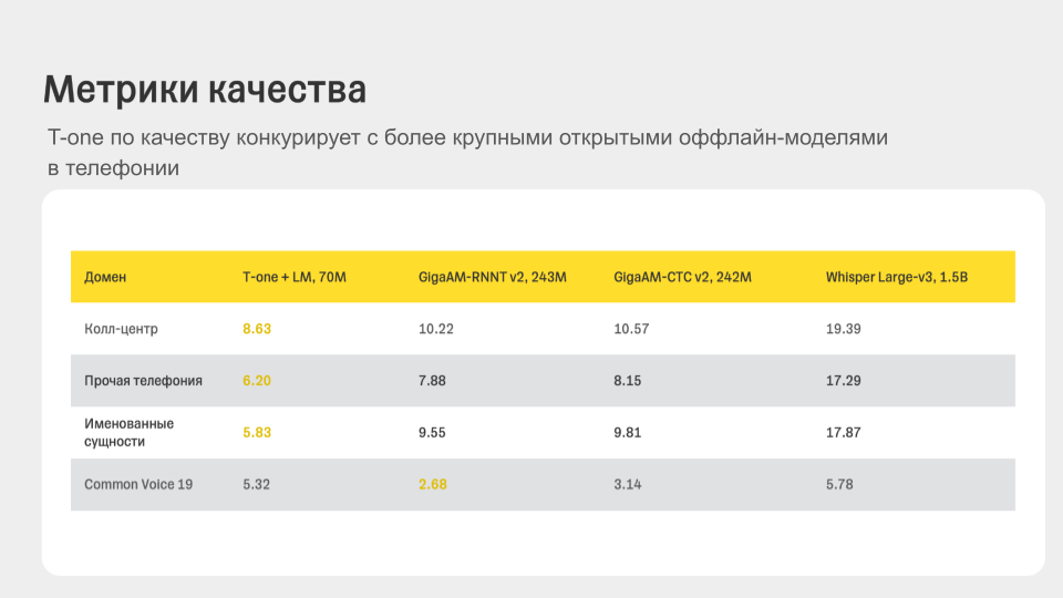Центр искусственного интеллекта группы «Т-Технологии» выложил в открытый доступ модель распознавания речи T-one. Это потоковая ASR-модель при сравнительно небольшом размере в 70 млн параметров лидирует среди других открытых моделей по качеству распознавания на русском языке на шумных и сжатых записях из колл-центров — именно там, где бизнес теряет деньги из-за ошибок распознавания. Открытие доступа «Т-Технологиями» к качественной потоковой модели распознавания речи Т-one позволит ускорить развитие экосистемы речевых технологий в России. Потоковое распознавание речи позволяет обрабатывать звонки в реальном времени, повышать скорость и качество обслуживания, а также снижать нагрузку на операторов и затраты на персонал. Модель изначально спроектирована для работы в реальном времени с аудиопотоком произвольной длины и обеспечивает низкую задержку, что критично для голосовых ассистентов, автоматизации колл-центров и аналитики звонков. Эта модель уже успешно используется во внутренних продуктах «Т-Технологий», включая службу поддержки Т-Банка, мобильного секретаря в Т-Мобайле, инструментах защиты от спам-звонков и др. Общепринятых валидационных датасетов для телефонии на русском в открытом доступе с должным качеством разметки не существует, но по внутренним бенчмаркам* по качеству распознавания на русском в телефонии Т-one обгоняет большие открытые ASR-модели: GigaAM v2 на 242–243 млн параметров и Whisper Large-v3 на 1,5 млрд параметров.