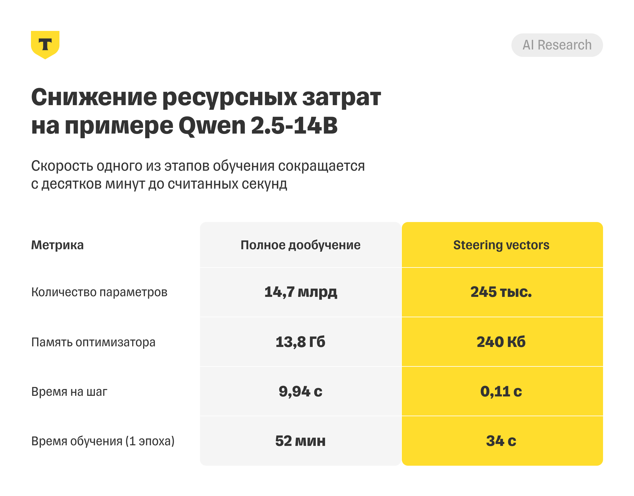 Исследователи из T-Bank AI Research и лаборатории Центрального университета Omut AI разработали новый метод обучения больших языковых моделей (LLM), который позволяет развивать у них способность к логическим рассуждениям без традиционных дорогостоящих подходов. Кроме снижения стоимости, метод также проясняет механизм, за счет которого модели осваивают навыки рассуждений. Новый метод позволит создавать рассуждающие модели не только для крупных ИТ-корпораций, но и для университетских лабораторий и небольших компаний. Он был представлен на одной из ведущих международных конференций в области ИИ по эмпирическим методам обработки естественного языка (EMNLP 2025) уровня, А*, которая проходит с 4 по 9 ноября в Сучжоу, Китай. Суть открытия Чтобы развить или улучшить рассуждения у больших языковых моделей, применяется обучение с подкреплением (reinforcement learning). Для этого корректируются миллиарды параметров — компонентов модели, в которых «хранятся» знания и правила ее работы, — что занимает большое количество памяти и требует значительных финансовых и технических ресурсов. Команда российских исследователей предложила альтернативу: вместо переписывания «мозга» модели они добавляют векторы-настройки (steering vectors) — компактные подсказки, которые усиливают правильные логические шаги предобученной модели. Векторы действуют как регуляторы громкости: модель уже умеет рассуждать, а steering vectors позволяют сделать «громче» правильные логические шаги. Метод подтвердил результативность на шести мировых бенчмарках по математическому рассуждению, показав сохранение качества до 100%: