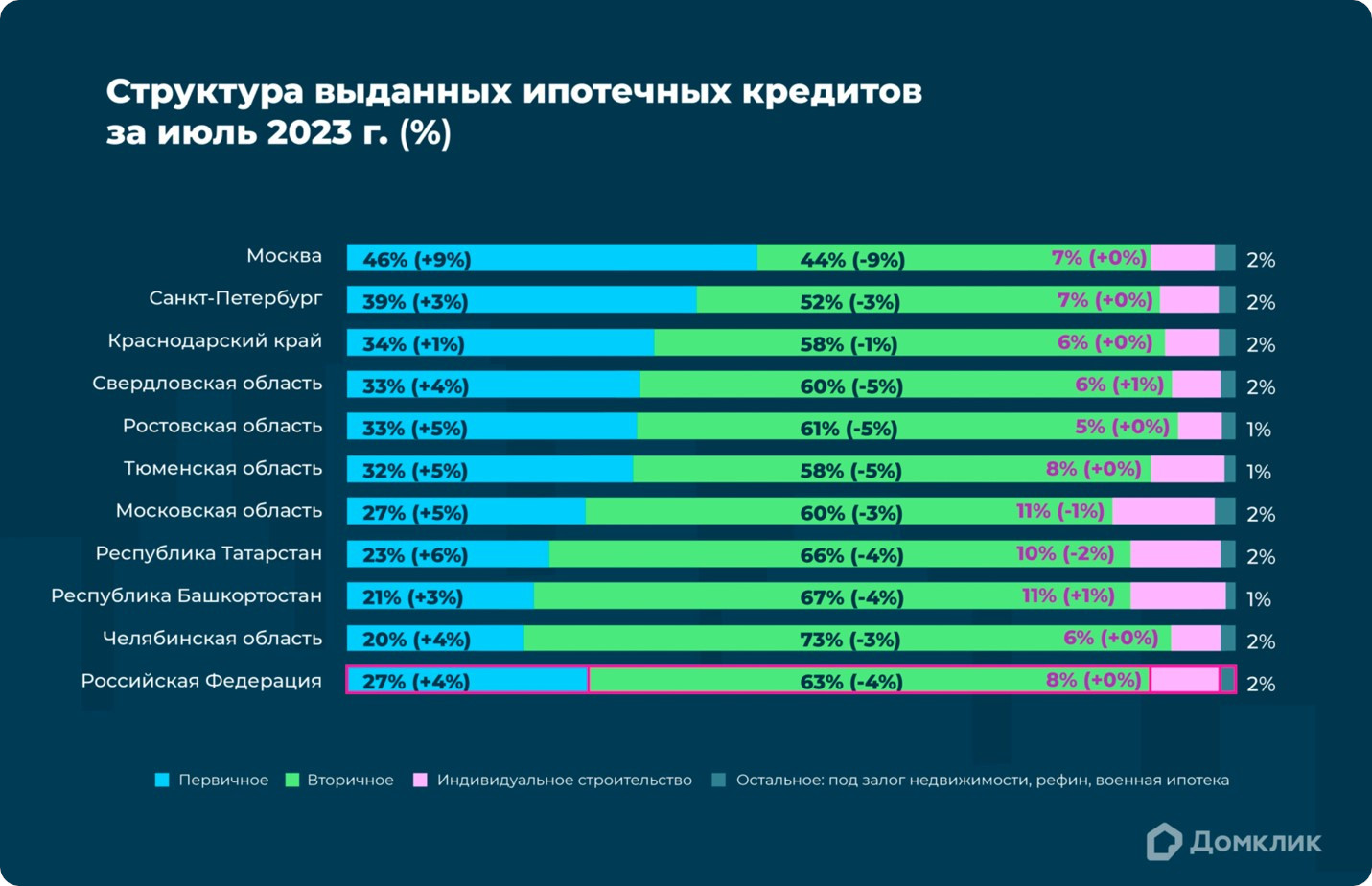 Распределение ипотеки по типам кредитов в июле 2023 г. (топ-10 регионов по количеству выдач). Приобретение первичного и вторичного жилья обозначено как «Первичное» и «Вторичное» соответственно. Приведены данные по индивидуальному строительству. «Остальное» включает в себя нецелевые кредиты под залог недвижимости, рефинансирование, военную ипотеку. Данные отсортированы по доле сделок по покупке первичной недвижимости в общем объёме выдач. Эксперты отмечают, что больше всего доля первичного рынка увеличилась в таких регионах, как Республика Коми (+9,5 процентного пункта), Москва (+9,4) и Чувашская Республика (+8,9). Несмотря на незначительное уменьшение количества выдач в июле (-3%) и сокращение доли в общем числе выданных кредитов (-4,3%), ипотека на вторичном рынке по-прежнему пользуется большим спросом: с марта ежемесячное количество выдач не опускалось ниже 70 тыс. По мнению аналитиков Домклик, это связано с невысокой доступностью новостроек по сравнению с готовым жильём. В то же время из-за ужесточения политики Центробанка и недавнего повышения ключевой ставки до 12% эксперты не ожидают роста доли вторичного рынка в общем количестве выдач ипотеки. Что касается ИЖС, число выдач побило рекорд пятый раз подряд (более 9 тыс.). Их доля в структуре жилищного кредитования сохраняется на высоком уровне (7,9%). Наибольшим приростом ИЖС отличились Республика Тыва (+14,1%), Камчатский край (+4,8%) и Калининградская область (+3,5%). Стоит отметить, что Республика Тыва входит в тройку лидеров по росту доли спроса на ИЖС уже на протяжении трёх месяцев. Источник: https://www.sberbank.ru/ru/sberpress/all/article?newsID=cdec8fd9-5fb0-41b5-a0ec-8d4f5b94...