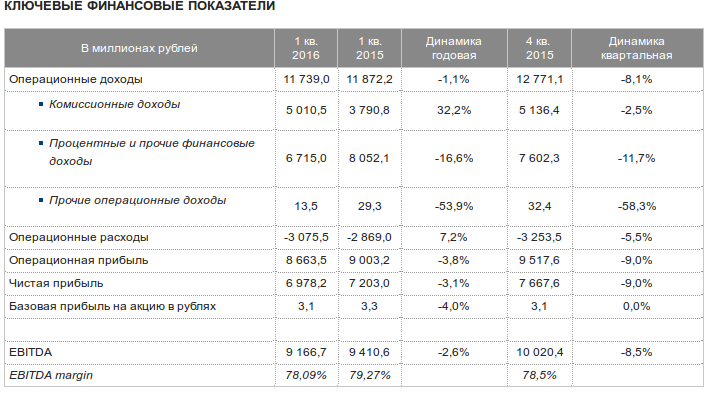 ПАО Московская Биржа (MOEX) объявляет о финансовых результатах первого квартала 2016 года по МСФО. Высокие доходы биржи за указанный период обусловлены ростом комиссионных доходов на денежном, валютном и срочном рынках, а также рынке облигаций. ОСНОВНЫЕ ОПЕРАЦИОННЫЕ И ФИНАНСОВЫЕ РЕЗУЛЬТАТЫ В ПЕРВОМ КВАРТАЛЕ 2016 ГОДА