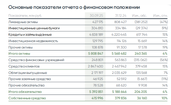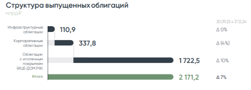 Активы — Кредитный портфель вырос на 15% и достиг 4,8 трлн руб. Главным драйвером роста в 2025 году стал портфель кредитов проектного финансирования, который увеличился на 23%. Опережающий рост кредитного портфеля в данном сегменте отражает фокус ДОМ.РФ на инвестициях капитала в наиболее рентабельные направления с низким уровнем риска. — Ликвидные активы снизились на 47% в связи с возвратом средств по завершившимся операциям с краткосрочными депозитами и сделкам обратного РЕПО. Высвободившиеся средства были направлены в рост кредитного портфеля в маржинальных сегментах (в т.ч. проектного финансирования застройщиков). — Инвестиционная недвижимость. Рост баланса на 14% в наибольшей степени связан с продолжением реализации программы «Доступное арендное жилье в Дальневосточном федеральном округе». Обязательства — Средства клиентов увеличились на 15% с начала года и составили 2,8 трлн руб. на фоне роста портфеля средств физических лиц на 23%. Опережающий рост портфеля средств физических лиц согласуется со стратегией компании по диверсификации источников фондирования и, как следствие, дальнейшему снижению его стоимости. — Облигации выпущенные. За 9 месяцев 2025 года были выпущены облигации с ипотечным покрытием в рамках секьюритизации на 386 млрд руб., а также биржевые облигации на 115,5 млрд руб. — Средства финансовых учреждений снизились за счет погашения сделок срочных депозитов банков и сокращения портфеля прямого РЕПО.
