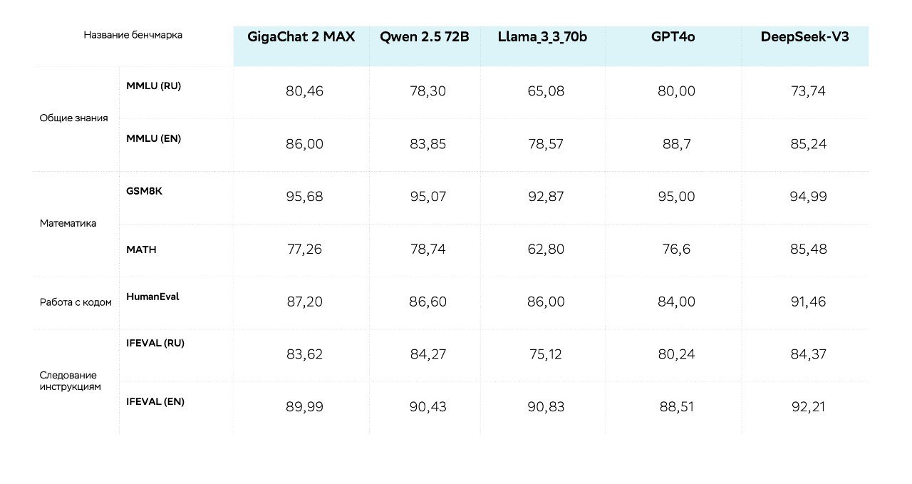 По данным бенчмарка MERA для русского языка, модель Сбера GigaChat 2 MAX занимает первое место среди AI-моделей, а в международных бенчмарках обновлённый модельный ряд превосходит по многим показателям GPT4o, DeepSeek-V3, LLaMA 70B и Qwen2.5. Весь модельный ряд GigaChat 2.0 получил значительный апгрейд, что позволяет бизнес-клиентам быстрее и качественнее решать текущие задачи и реализовывать масштабные проекты. • GigaChat 2 MAX стал ещё мощнее и уверенно опережает многие зарубежные аналоги в задачах на русском языке. • GigaChat 2 Pro демонстрирует качество на уровне предыдущей версии МАХ и справляется с задачами, в которых важны креатив и точность. При этом сама модель менее требовательна к ресурсам. • GigaChat 2 Lite — базовая модель для решения лёгких задач — по качеству теперь сопоставима с предыдущей версией Pro: на ней можно быстрее и выгоднее решать сложные задачи. Пользователи сохраняют доступ к моделям первого поколения и могут протестировать GigaChat 2.0, прежде чем перейти на новый модельный ряд. Чтобы подобрать оптимальную для своего бизнеса версию GigaChat и промпты для неё, необязательно разбираться в программировании. Вся линейка доступна бизнесу в облаке через API, её также можно развернуть локально в инфраструктуре компании (on-premise). Андрей Белевцев, старший вице-президент, руководитель блока «Технологическое развитие» Сбербанка: GigaChat 2.0 — не просто рост метрик и технических характеристик, а значительный шаг в развитии русскоязычных больших языковых моделей (LLM). Мы создали модель на уровне лучших мировых решений, а в задачах на русском языке модель превосходит большинство из них. Сильные отечественные нейросети стратегически важны для любого бизнеса, который ведёт свою деятельность в России. 15 тысяч внешних клиентов уже используют GigaChat, и мощное обновление нашей линейки позволит ещё большему числу клиентов эффективнее решать огромный спектр задач. Совершенствуя процессы с помощью искусственного интеллекта, компании получат уникальную возможность опередить конкурентов, увеличить прибыль и повысить лояльность потребителей. Позволяют создавать более продуктивных AI-агентов На базе GigaChat 2.0 компании смогут создавать более продуктивных автономных помощников (AI-агенты), способных рассуждать и самостоятельно решать сложные многокомпонентные задачи. Это стало возможным, поскольку модели увеличили свои знания в математике, естественных и гуманитарных науках, научились лучше программировать и писать более качественный код. Для разработки агентов на Python и JS можно использовать популярный SDK LangChain, с которым GigaChat полностью совместим. Пакеты совместимости — в публичном репозитории GigaChain. Обрабатывают в четыре раза больше контекста Модели нового поколения гораздо дольше удерживают контекст беседы, отвечают на сложные длинные вопросы и анализируют больше текста. Если раньше в один запрос можно было загрузить примерно 48 страниц A4 с текстом (шрифт 14 pt), то теперь максимальный объём запроса вырос почти до 200 страниц. Поэтому с GigaChat 2.0 удобнее создавать чат-ботов. В два раза лучше решают рабочие задачи Новые модели в два раза точнее следуют инструкциям пользователя и на 25% лучше отвечают на вопросы: соблюдают заданные форматы и условия, формируют ответы в определённом стиле, что помогает эффективнее решать рабочие задачи: готовить сопроводительную правовую документац