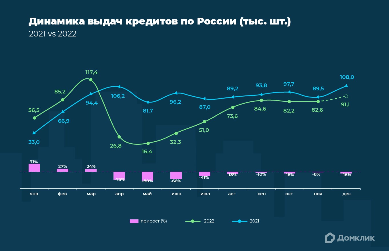 Сравнение динамики выдач ипотечных кредитов по РФ за 2022 год (обозначена зелёным) и 2021 год (обозначена синим). Розовым показана величина прироста год к году (%). В первом полугодии покупательская активность была подвержена сильным колебаниям. В феврале — марте был зафиксирован ажиотажный спрос на недвижимость и количество ипотечных сделок выросло на 25% по сравнению с февралём и мартом 2021 года. В мае — июне спрос, напротив, резко упал из-за роста цен на жильё и ужесточения условий ипотеки. По сравнению с маем — июнем 2021 года сделок стало на 66–80% меньше. В III квартале 2022 года рынок недвижимости начал восстанавливаться. Количество сделок по сравнению со II кварталом выросло в 2,8 раза, а отставание от показателей 2021 года снизилось до 10%. Основные причины — снижение ключевой ставки ЦБ до докризисного уровня (8%) и наличие льготных программ и скидок от застройщиков. По данным ноября 2022 года, разрыв по количеству выдач ипотеки от показателей 2021 года оказался минимальным (-8%). Вопреки прогнозам, события конца сентября не вызвали резкого снижения спроса на ипотечное кредитование: за октябрь количество сделок снизилось на 2,4% по отношению к сентябрю, а в ноябре количество сделок практически не изменилось (+0,4%, по отношению к октябрю). Мы полагаем, сохранению спроса способствовало множество факторов, среди которых можно выделить сезонное увеличение покупательской активности, а также объявление о возможной отмене программы господдержки и разговоры об ограничении ипотеки с околонулевыми ставками. Мария Ромчанова, руководитель аналитического центра дивизиона «Домклик» Сбербанка Всего за период с января по ноябрь 2022 года Сбербанк выдал 709 тыс ипотечных кредитов на сумму около 2,18 трлн рублей (-13% по отношению к 2021 году). Аналитики также отмечают, что за год изменилось распределение выдач по регионам. Так, в Москве и Санкт-Петербурге количество сделок за год снизилось на 14 и 18% соответственно. А в большинстве крупных городов-миллионников из топ-10 спрос на ипотеку и количество сделок, наоборот, выросли на 5–10%.