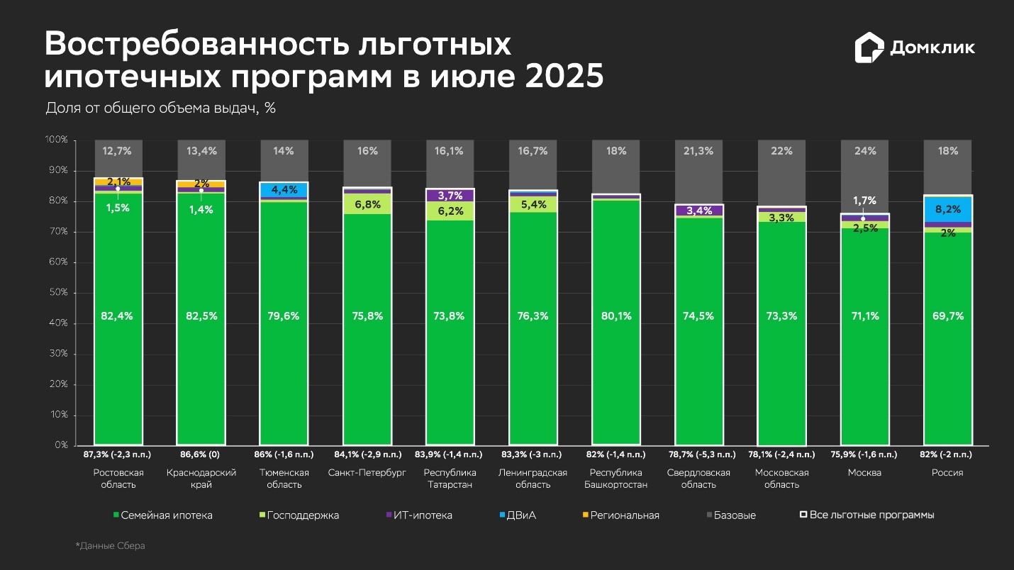 Рост спроса на «Семейную ипотеку» Объём выдач по «Семейной ипотеке» также показал значительный рост: в июле Сбер выдал 159,2 млрд руб., что на 15% больше, чем в июне 2025 года. Если смотреть на годовую динамику (июль 2025 к июлю 2024), то выдачи по Семейной ипотеке и вовсе выросли более чем в два раза — на 110%. Доля «Семейной ипотеки» увеличилась на 0,6 п. п. по сравнению с июнем 2025 года, приблизившись к 70% от всего рынка. Наиболее высокая доля «Семейной ипотеки» в выдачах стабильно наблюдается в Республике Хакасия (91,9%) и Республике Адыгея (91,1%). Третье место — у Астраханской области, где на господдержку семей с детьми пришлось более 87% всех выдач. Среди регионов — лидеров по объёму выдач (представлены на инфографике) высокая доля выдач по «Семейной ипотеке» отмечается в Краснодарском крае (82,5%) и Ростовской области (82,4%). Другие льготные программы Рекордный спрос зафиксирован и на «Дальневосточную и Арктическую ипотеку» (ДВиА). В июле по этой программе Сбер выдал около 19 млрд рублей — чуть больше за последние два года было только в августе 2024 года: 19,2 млрд. Доля «Дальневосточной и Арктической ипотеки» в этот раз составила 8,2%, а в целом на протяжении года доля ДВиА колеблется в диапазоне 7–9%. По доле от общего объёма выдач ДВиА преобладает в Бурятии (80%), Якутии (76,4%) и Амурской области (71,8%). Среди регионов, представляющих Арктическую зону России, сравнительно высокая доля выдач по ДВиА отмечена в Архангельской области — 64,7%. Снижение спроса отмечено по ИТ-ипотеке: объём выдач сократился на 16,4%, до 3,9 млрд. В июле 2025 года лидерами по доле ИТ-ипотеки от общего объёма выдач стали Томская (7,2%) и Новосибирская (6,7%) области. Рыночная ипотека: рост в условиях высокой ключевой ставки Доля рыночных программ в июле увеличилась на 2 п. п., достигнув 18%. Выдачи по рыночным ипотечным программам выросли почти на 32%, превысив 41 млрд рублей. Всего с начала года объёмы выдач по базовой ипотеке увеличились почти в 4 раза, что демонстрирует адаптацию данного сегмента к существованию в условиях высокой ключевой ставки. Как и ранее, около 60% рыночных ипотечных выдач приходится на вторичное жильё. Наибольшая доля рыночных программ характерна для регионов с низкими объёмами строительства. В лидерах по июлю — Карачаево-Черкесская Республика (36,1%), Омская (33,2%) и Саратовская (32,7%) области. Методология: как считали аналитики С января 2025 года оценка востребованности льготных ипотечных программ изменилась: сейчас аналитики оценивают данные по объёму выделенных средств на ипотечные программы, а не по количеству сделок (выданных кредитов). Как и ранее, для расчётов используются данные по заключённым ипотечным сделкам Сбера. При подсчёте объёма выдач также учитываются транши (последующие выдачи), что объясняет присутствие на графиках завершившейся в прошлом году программы «Господдержка». Источник: https://www.sberbank.ru/ru/sberpress/all/article?newsID=8f8526a5-4f92-4808-8d86-ac56a793...