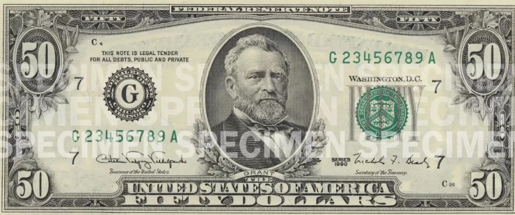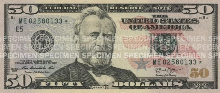 $50 — новую версию представили в 2004 году. Портрет президента Улисса Гранта на банкнотах остался, но стал заметно больше. В дизайне современной банкноты используются нежные синий и красный цвета.