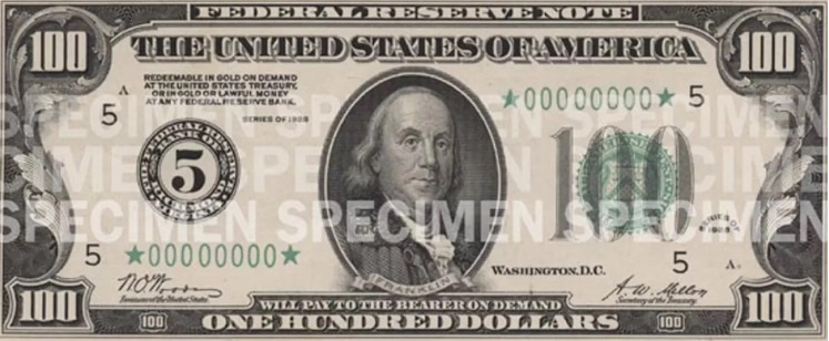 $100 — первые стодолларовые купюры появились в 1862 году, дизайн несколько раз менялся. Последняя версия дизайна появилась в 2013 году, но наиболее масштабное обновление произошло в 2009 году — в банкноту внедрили голографическую защитную нить, изображение чернильницы, рельефный оттиск.