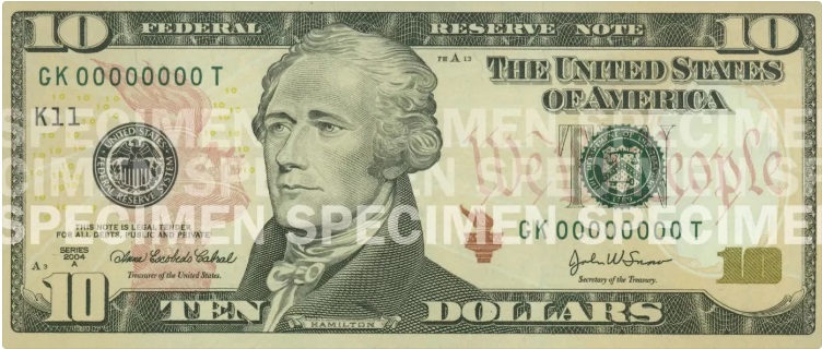 $10 — первые купюры этого номинала были выпущены в 1914 году и тогда несли портрет 7-го президента США Эндрю Джексона, в 1928 году «переехавшего» на банкноту в $20. На лицевой стороне купюр современного образца (так же, как на всех банкнотах этого номинала, выпущенных после 1928 года) изображен портрет одного из отцов-основателей США и первого министра финансов страны Александра Гамильтона. Только на старых банкнотах его портрет заметно меньше и заключен в рамку. Банкнота текущего дизайна поступила в обращение в 2006 году и имеет нежные фоновые цвета: оранжевый, желтый и красный.