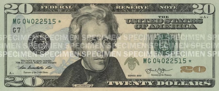 $20 — сейчас банкнота имеет нежный фон зеленого и персикового цветов. На оборотной стороне банкноты изображен Белый дом, а на лицевой — Эндрю Джексон. По сравнению с версиями 1928-1990 годов портрет стал намного больше и лишился виньетки. На «двадцатках» образца 1914 года, которые тоже считаются законным платежным средством, вместо Джексона изображен президент Гровер Кливленд.