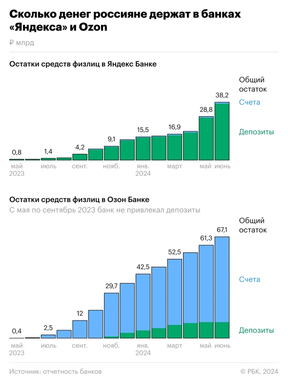 Как сделаны расчеты РБК проанализировал динамику остатков на счетах российских банков, отражающих депозиты клиентов физлиц, в том числе нерезидентов. Еще один банк, принадлежащий маркетплейсу, — Вайлдберриз Банк — пока не имеет в своей линейке депозитов. В его оборотной ведомости на 1 июня 2024 года нет этого типа счета. РБК также оценил движение средств по счету 408, на котором учитываются в том числе средства физлиц. На 1 июня остатки по нему в Яндекс Банке составляли 0,8 млрд руб. (они увеличились в 2,1 раза с начала года), в Озон Банке — 56,7 млрд руб. (+50,7%), в Вайлдберриз Банке — 17,9 млрд руб. (рост в 2 раза). Как маркетплейсы обзавелись банками Весной 2021 года онлайн-ретейлер Ozon купил у Совкомбанка небольшой Оней-банк и переименовал организацию в Озон Банк. Однако в феврале 2022 года тот по ошибке попал под блокирующие санкции США за связь с Совкомбанком. Вскоре ограничения были сняты, но Ozon успел зарегистрировать новый банк (Еком Банк) и впоследствии просто объединил обе кредитные организации в одну. В июле 2022 года Озон Банк запустил дебетовую карту, которая позволяет оплачивать товары на маркетплейсе со скидкой, а с декабря 2023-го стал привлекать средства физлиц на депозиты. «Яндекс» приобрел небольшой банк «Акрополь» летом 2021 года и вскоре переименовал его в Яндекс Банк. В сентябре 2022-го в линейке кредитной организации появились дебетовые карты, еще примерно через год — вклады. В феврале 2021 года основная владелица и глава онлайн-ретейлера Wildberries Татьяна Бакальчук приобрела 100% акций банка «Стандарт-Кредит». Через несколько месяцев он был переименован в Вайлдберриз Банк. С января 2022 года организация стала выпускать дебетовые карты, а через два года в ее линейке появился электронный кошелек «WB Кошелек» для оплаты товаров на маркетплейсе. Согласно информации на сайте Banki.ru, в Вайлдберриз Банке есть вклад «Накопительный», но оформить его через агрегатор нельзя. Организация занимает 163-е место по активам в России. Почему банки маркетплейсов так быстро растут По итогам 2023 года число активных покупателей на Ozon достигло 46,1 млн человек, на «Яндекс Маркете» — 17,6 млн, сообщали компании. Кроме маркетплейса у «Яндекса» есть другие сервисы, за пользование которыми пользователи платят, такие как «Яндекс Такси» и «Яндекс Плюс». Аудиторию последнего в феврале компания оценивала в 30 млн человек. Wildberries оценивал покупательскую аудиторию площадки Увеличение размера депозитной базы банков «Яндекса» и Ozon обусловлено высокими ставками по вкладам и возможностями этих игроков рекламировать свои финансовые продукты на маркетплейсах, считает управляющий директор рейтингового агентства НКР Михаил Доронкин. «К тому же при оплате услуг картами этих банков в рамках экосистем и маркетплейсов предлагаются заметные скидки либо кешбэк, что стимулирует активных пользователей пополнять карты, чтобы в последующем ими расплачиваться за товары, такси, доставку продуктов и прочее», — добавляет он. «Эти банки работают по модели asset light, то есть они не держат кредиты на своих счетах, им не надо слишком много пассивов, им не надо слишком много капитала. Для того чтобы этим банкам продолжать быть успешными и наращивать портфели более быстрыми темпами, меньше зависеть от других банков и к тому же получать полностью маржу от кредитования, им, конечно же, весьма логично прод