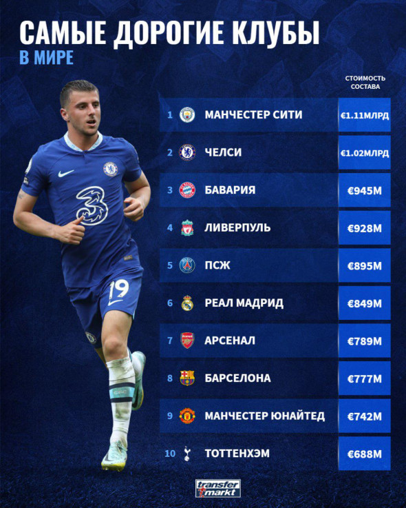 Лондонский клуб «Челси» впервые в своей истории преодолел отметку в €1 млрд по трансферной стоимости игроков команды. «РБК Спорт» составил список самых дорогих клубов мира по данным портала Transfermarkt «Тоттенхэм Хотспур» (Англия) Стоимость: €688,3 млн Открывает топ-10 самых дорогих команд лондонский «Тоттенхэм». Общая стоимость клуба на 2023 год составляет: €688,3 млн. Основными игроками, которые повлияли на стоимость являются Харри Кейн (€90 млн), Сон Хын Мин (€70 млн) и Кристиан Ромеро (€60 млн). Их стоимость составляет одну треть от общей суммы всей команды. Средняя стоимость игроков команды составляет €26,47 млн. Стоимость клуба увеличилась за счет дорогой летней трансферной компании (суммарно потрачено €169 млн.). Самым дорогим приобретением перед стартом сезона 2022/23 является бразильский форвард Ришарлисон, купленный у «Эвертона» за €58 млн. В летнее трансферное окно лондонский клуб не отличился громкими продажами, всего их было три. Единственный игрок, ушедший за сумму более чем €10 млн — Стивен Бергвейн. Голландский «Аякс» приобрел вингера за €31,25 млн. «Манчестер Юнайтед» (Англия) Стоимость: €742,1 млн «Манчестер Юнайтед» значительно потерял в стоимости по сравнению с прошлым годом. Виной тому стала летняя трансферная компания команды. Клуб покинули Поль Погба, Криштиану Роналду и Неманья Матич — все они ушли как свободные агенты. Остальные трансферы на выход не превысили €10 млн и не особо повлияли на общую стоимость. Из громких приобретений можно выделить переходы бразильца Антони (€95 млн), экс-игрока «Реала» Каземиро (€70,65 млн) и Лисандро Мартинеза (€57,37 млн). Самыми дорогими игроками команды являются Бруно Фернандеш (€75 млн), Антони (€75 млн) и Джейдон Санчо (€60 млн). «Барселона» (Испания) Стоимость: €777 млн Самым дорогим трансфером «Барселоны» в межсезонье стал переход Рафиньи из «Лидс Юнайтед» за €58 млн: в 16 матчах он отличился 2 голами и 3 голевыми передачами, защитник Жюль Кунде перешел из «Севильи» за €50 млн, но из-за полученных травм провел лишь 10 матчей. Трансфер Роберта Левандовского за €45 млн стал самым удачным для каталонского клуба: в 15 играх поляк забил 13 голов и отдал 4 ассиста, являясь лучшим бомбардиром чемпионата Испании после 17 туров. Самыми ценными игроками команды являются воспитанники клуба: 20-летний Педри (€100 млн) и 18-летний Гави (€90 млн). В нынешнем сезоне на счету Педри 4 гола, Гави отличился двумя ассистами. «Арсенал» (Англия) Стоимость: €789 млн Лондонский «Арсенал» стал одним из главных прорывов этого рейтинга. В прошлом году они занимали четырнадцатое место с общей стоимостью €526 млн. Резкий скачок обусловлен успешным выступлением молодых игроков и летней трансферной компанией. Были приобретены Габриэль Жезус (€52,20 млн), Фабио Виейра (€35 млн) и Александр Зинченко (€35 млн). В свою очередь, в летнее трансферное окно не состоялось серьезных трансферов на выход. Единственная продажа свыше €10 млн — Матео Гендузи, перешедший в марсельский «Олимпик» за €11 млн. Самыми дорогими игроками команды являются Букайо Сака (€100 млн), Габриэль Жезус (€70 млн) и Мартин Эдегор (€60 млн). В данный момент «Арсенал» занимает первое место в Английской премьер-лиге (АПЛ), что также отразилось на взлете стоимости игроков. К примеру, полузащитник Мартин Эдегор с момента перехода подорожал на €20 млн, а вингер Букайо Сака, являющийся воспитанн