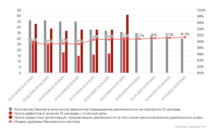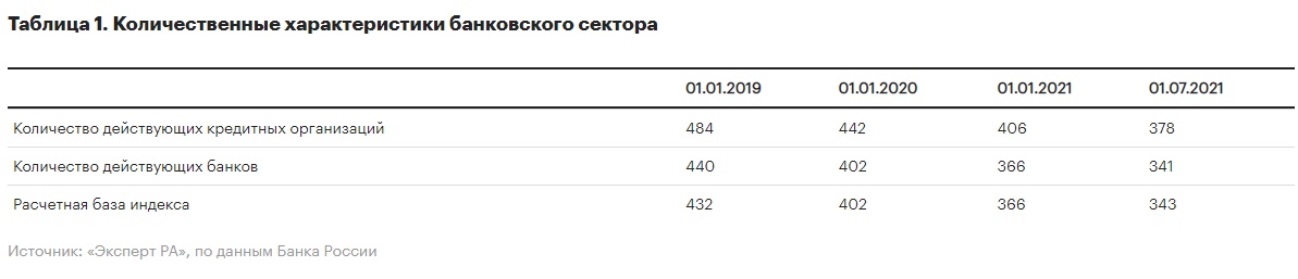 В 2019 и 2020 годах в совокупности прогнозировалось прекращение деятельности до 84 кредитных организаций. Фактически за указанный двухлетний период рынок покинул 81 участник, что свидетельствует о достаточно высоком уровне предсказательной силы применяемых моделей. На горизонте ближайших четырех кварталов (периода с 01.07.2021 по 01.07.2022) до 30 кредитных организаций, или 8,7% расчетной базы индекса, находятся в зоне повышенного риска прекращения деятельности. Это математическое ожидание уходов с рынка, основанное на исторической частоте соответствующих событий. Прогноз может быть реализован посредством всей совокупности вероятностных событий, таких как вывод с рынка по регуляторным основаниям, добровольное аннулирование лицензии, реорганизация в форме присоединения к другой кредитной организации.