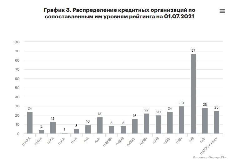 Расчет индекса и прогнозы агентства основаны на сопоставлении каждому банку вероятности дефолта на основе частоты дефолтов, исторически характерной для уровня рейтинга, который фактически присвоен банку или оценен как наиболее вероятный. На графике 3 представлено составленное таким образом распределение действующих кредитных организаций по уровням рейтинга на 01.07.2021. 49,5% кредитных организаций классифицированы в рейтинговые категории не выше B, 28,6% - в рейтинговые категории BB и BBB, 21,9% - в категории от A до AAA, соответствующие высокому кредитному качеству.