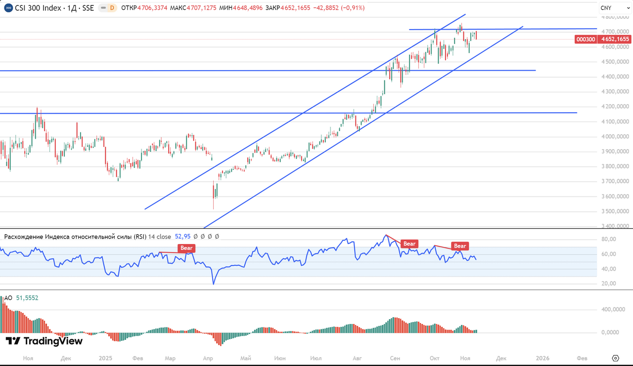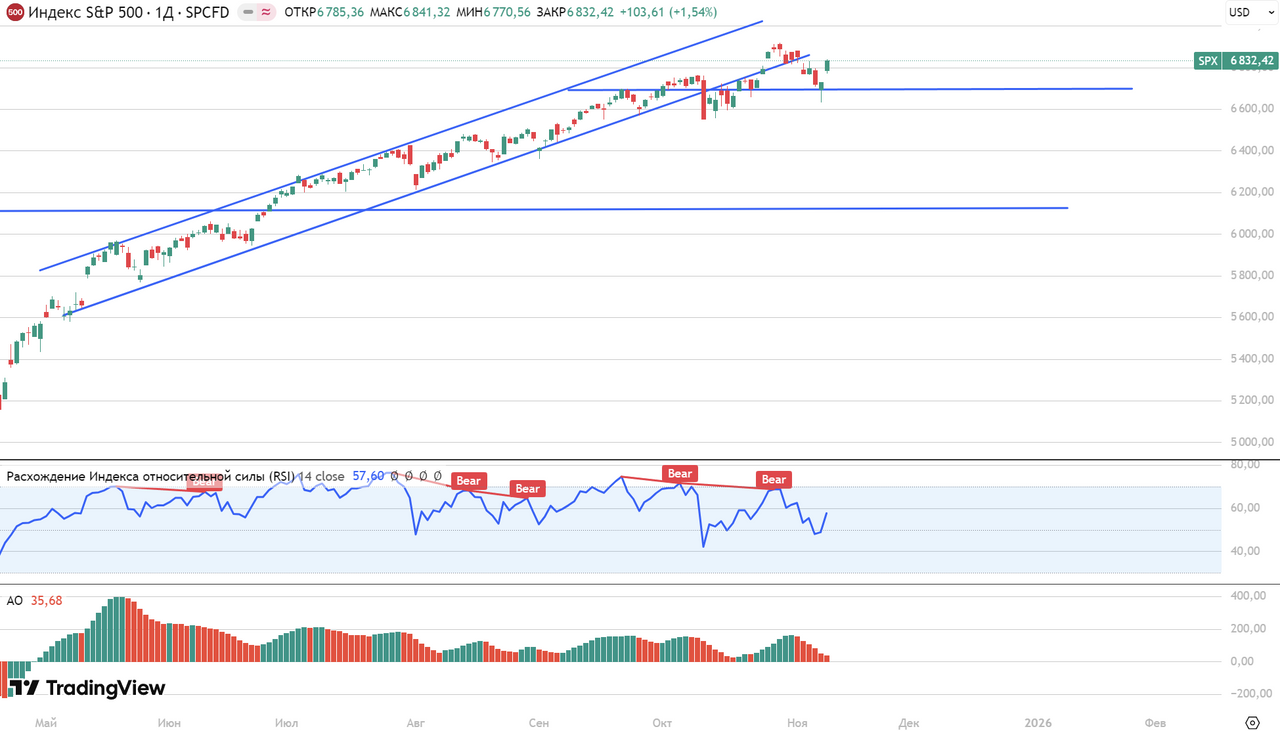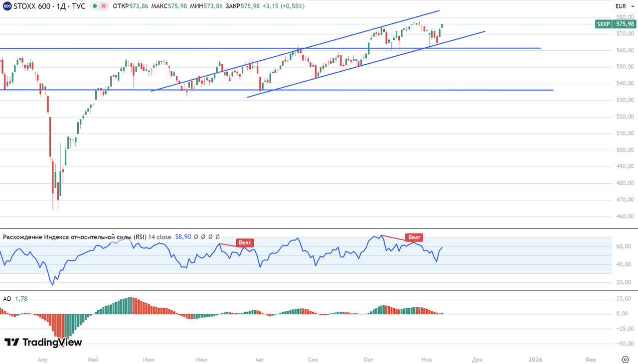 Американские фондовые индексы завершили понедельник сильным восстановлением. По итогам понедельника S&P 500 прибавил 1,54% до уровня в 6832 п. Nasdaq Composite вырос на 2,27% до 23 527 п. Dow Jones Industrial Average вырос на 0,81% до 47 368,10 п. Основной позитив пришелся на заявления Дональда Трампа о прекращении шатдауна в ближайшие дни и восстановлении отношений с Китаем. Во вторник фьючерс на S&P 500 торгуется в -0,10%, так как новость о шатдауне была отыграна вчера. Сегодня индексы Европы демонстрируют уверенный рост, догоняя американское вчерашнее бурное восстановление. Поскольку в США множество компаний, работающих на госзаказ США, остановка шатдауна позитивно скажется и на европейских партнеров. Британский FTSE 100 растет на 0,95%, французский CAC 40 на 1,32%, немецкий DAX торгуется около нуля в плюсе на 0,08%. Общий европейский индекс STOXX 600 растет на 0,49%. Рынки акций Азиатско-Тихоокеанского региона демонстрируют разные направления на фоне нахождения вблизи исторических максимумов. Китайский индекс CSI 300 снижается на 0,91% до 4652,17 пункта из-за опасений относительно замедления экономического роста. Сильнее всего снижается Spic Yuanda Environmental Protection Co, занимающаяся зеленой энергетикой, бумаги снижаются на 10,00%. Также снижаются технологические Yijiahe Technology Co и Guangdong Jia Yuan Technology на 7,34% и 5,48%, соответственно. Министерство торговли КНР приняло меры к разрешению экспорта некоторых чипов с китайского предприятия Nexperia и призвало ЕС оказать давление на правительство Нидерландов с целью снятия ограничений с этой компании, принадлежащей китайской Wingtech Technology. Продажи новых авто в Китае за январь-октябрь выросли на 12,4% (г/г) (против роста на 2,7% годом ранее). Продажи в октябре выросли на 8,8% (г/г) (против роста на 14,9% в сентябре) Японский индекс Nikkei закрылся небольшим ростом на 0,13% до 50 980 п. на фоне восстановления положительного сальдо торгового баланса и наращивания экспорта. Положительное сальдо счета текущих операций платежного баланса Японии в сентябре выросло до рекордных 4,48 трлн иен ($29,07 млрд) по сравнению с 1,54 трлн иен годом ранее, сообщило министерство финансов страны. Экспорт в позапрошлом месяце увеличился на 8,6%, импорт — на 1,7%. В лидерах роста — строительный конгломерат Kajima Corp, бумаги растут на 8,86%. Японский гигант Toyota растет на 0,51% на фоне восстановления экспорта. Корейский KOSPI растет сегодня на 0,81% до 4106 п., до исторического максимума остается меньше 100 пунктов. Корея растет в основном за счет восстановления мирового технологического сектора после соглашения Китая и США. В лидерах роста корейские гиганты Samsung Electronics Co и Sony Corp, бумаги растут на 2,88% и 5,51%, соответственно. На российском рынке сегодня наблюдается спящая динамика, Индекс Московской биржи на 11:20 снижается на 0,01% до 2558 п. Вчерашний бурный рост, а затем такое же бурное падение вымотали инвесторов. Однако есть и позитивные новости. Минфин РФ не поддержал введение налога на сверхприбыль банков, который использовался несколько лет назад, это краткосрочно является позитивом, но если об этом начали говорить, то в итоге все может поменяться в обратную сторону, при существующем дефиците бюджета и рекордных прибылях банков. Динамика котировок нефти отрицательная, Brent снижается на 0,22% до 63,92$. При этом рубль перестал укрепляться, второй день наблюдается растущая динамика доллара, сегодня пара доллар/рубль растет на 0,08% до 81,31руб./долл. Сегодня стартова