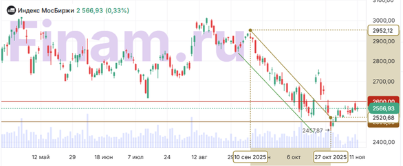 Российский рынок акций 11 ноября завершил торги умеренным ростом. Небольшой позитив оказали новости о том, что Минфин не поддержал законопроект о налоге на сверхприбыль банков, что улучшило настроение в финансовом секторе. Некоторую поддержку также оказало сообщение о принятии Госдумой закона, освобождающего от НДС выплату процентов по вкладам в драгоценных металлах. По итогам сессии Индекс МосБиржи увеличился на 0,31% и составил 2566,5 пункта, а долларовый индекс РТС упал 0,1%, достигнув уровня 993,9 пункта. Лидерами роста стали акции ММК (+3,31%), ДВМП (+2,96%), «НоваБев Груп» (+2,72%), НЛМК (+2,06%), «Северстали» (+2,00%), «Россетей Центр» (+1,96%), «Распадской» (+1,09%), «Газпрома» (+1,03%), «РуссНефти» (+0,88%) и «Транснефти» (+0,84%). В красной зоне оказались бумаги Ozon (-3,16%), «Позитива» (-2,64%), ПИК (-2,04%), ОВК (-0,94%), МТС (-0,88%), ОГК-2 (-0,63%), «ЛУКОЙЛа» (-0,34%), «М.Видео» (-0,32%), «СОЛЛЕРС» (-0,30%) и «Магнита» (-0,28%). «Юнипро» представил финансовые результаты по РСБУ за январь-сентябрь 2025 года. Чистая прибыль составила 28,5 млрд руб. (-9,8% г/г). Выручка за девять месяцев выросла на 3,7% до 102,5 млрд руб., себестоимость продаж увеличилась на 17,1% до 77,7 млрд руб. Прибыль от продаж составила 24,7 млрд руб. (-23,7%), прибыль до налогообложения снизилась на 4,5% до 37,6 млрд руб. Аэрофлот опубликовал операционные результаты за 10 месяцев 2025 года. Пассажирооборот группы вырос на 2,7% и достиг 130,3 млрд пассажиро-км, предельный пассажирооборот увеличился на 2,5%. За отчетный период перевезено 47,2 млн человек. Это на 0,1% ниже, чем годом ранее. Инвесторам, интересующимся российским рынком акций, мы по традиции рекомендуем обратить внимание на стратегию «RU. Капитал и дивиденды». Технический анализ Индекс МосБиржи Индекс МосБиржи остается вблизи отметки 2566,9 пункта. После отскока от уровня сопротивления 2600 пунктов рынок перешел в фазу консолидации в диапазоне 2500-2600 пунктов. При усилении давления со стороны продавцов не исключено движение к уровню поддержки в районе 2500 пунктов.