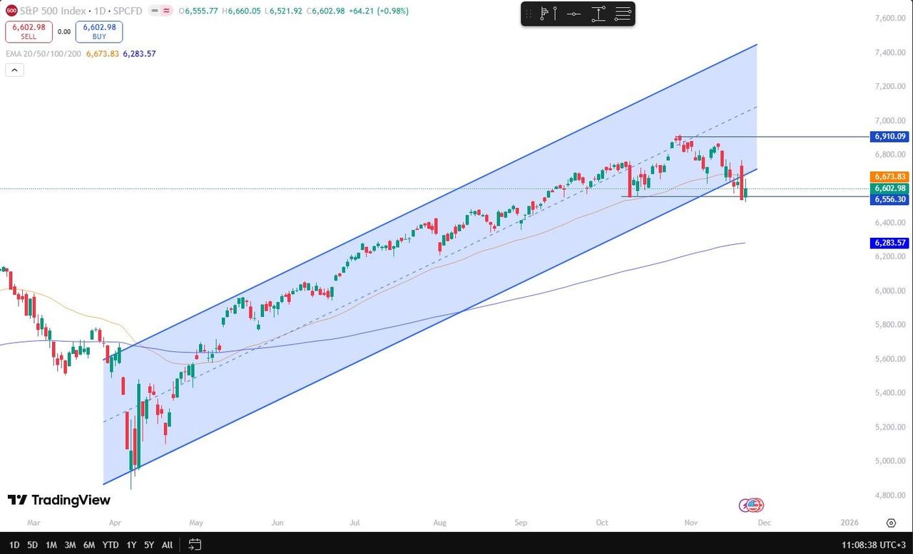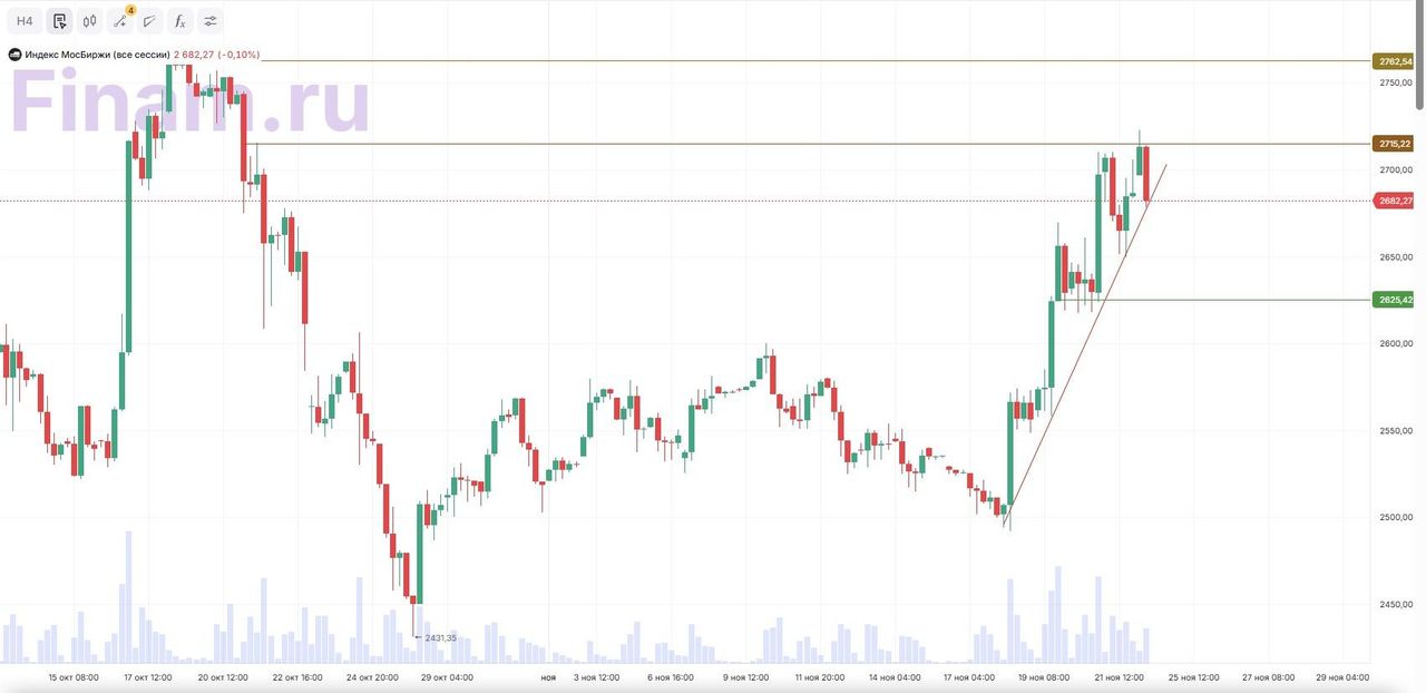 Фондовые индексы США в пятницу выросли после комментариев президента ФРБ Нью-Йорка Джона Уильямса, который допустил возможность еще одного снижения процентной ставки в этом году. По итогам пятницы S&P 500 вырос на 0,98% до уровня в 6601,99 п. Nasdaq Composite увеличился на 0,88% до 22 273,08 п. Dow Jones Industrial Average вырос на 1,08% до 46 245,41 п. Фьючерсы на американские индексы в понедельник утром демонстрируют рост. Уильямс отметил, что политика ФРС все еще умеренно жесткая, но теперь есть пространство для дальнейшего смягчения, что рынки восприняли как сигнал к вероятному декабрьскому снижению ставки. Вероятность декабрьского снижения выросла с 40% до более чем 70%. На этом фоне лучше рынка смотрелись акции, чувствительные к снижению ставок, такие как Home Depot (+3,4%), Starbucks (+3,3%) и McDonald’s (+1,71%). Однако даже с пятничным ростом все три индекса завершили неделю в минусе — S&P 500 и Dow потеряли около 2%, Nasdaq — 2,7%. Инвесторы все еще переживают из-за слабости экономики, высокой волатильности и неопределенности по политике ФРС. При этом сектор технологий, включая Nvidia (-0,97%), показал резкое ослабление. Аналитики считают происходящее нормальной сезонной коррекцией после сезона отчетности. Европейские фондовые рынки завершили пятничную сессию снижением на фоне усиления опасений по поводу переоцененности компаний, связанных с искусственным интеллектом, а также ухудшения макроэкономических показателей. Европейский индекс STOXX 600 сегодня демонстрирует снижение на 0,33% до 562,10 п. Розничные продажи в Великобритании в октябре снизились на 1,1% (м/м), индекс потребительского доверия опустился до -19 пунктов. Во Франции индекс делового доверия снизился с 101 до 98 пунктов. Предварительный сводный PMI еврозоны уменьшился до 52,4 пункта (с 52,5), при этом PMI услуг упал до 51,3 (с 53), а промышленный PMI — до 49,7 (с 50). Давление на рынок оказывает технологический сектор: акции ASML упали на 1,73%. Значительно скорректировались и оборонные компании: Rheinmetall — на 3,95%, Hensoldt — на 4,1%, Thales — на 2,5%. Нефтегазовый сектор также снижается: BP — на 0,53%, Shell — на 0,46%, Equinor — на 0,76%. Veolia Environnement выросла на 1,35% после объявления о сделке по покупке Clean Earth за $3 млрд. Азиатские рынки движутся разнонаправленно. Китайский индекс CSI 300 падает на 0,12% до 4 448,05 пункта. Hang Seng растет на 1,77% до 25 665,55 п. В целом преобладает оптимизм на фоне позитивных настроений на американских рынках. Бумаги Alibaba Group Holding Ltd. подскочили на 3,83% после того, как ее основное AI-приложение было загружено более 10 миллионов раз, что создает хорошие перспективы в ее попытках создать конкурента ChatGPT. Сегодня Индекс МосБиржи снижается на 0,07% до 2682,98 п. из-за высокой неопределенности вокруг геополитических событий и ожидания новостей по возможному урегулированию конфликта на Украине. Дополнительно на рынок давят падение цен на нефть и снижение курсов иностранных валют, что ограничивает доходы экспортеров. Инвесторы пока действуют осторожно на фоне отсутствия позитивных сигналов. Объем продаж первичной недвижимости «Самолета» вырос на 45% и составил 25,3 млрд рублей (113,3 тысячи кв. м) по сравнению с 17,4 млрд рублей (80,9 тыс. кв. м) за октябрь 2024 года. Акции компании растут на 0,8%. Чистая выручка «Черкизово» в III квартале 2025 года выросла на 14% (г/г) до 73,9 млрд рублей. За 9 месяцев показатель поднялся на 11,2% (г/г) — до 211 млрд рублей. Чистая прибыль в III квартале выросла на 160,4% (г/г) - до 16,7 млрд рублей, а за 9 месяцев р