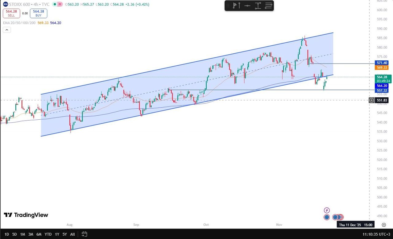 Индекс МосБиржи скорректировался от уровня сопротивления в 2715 п. до наклонной линии тренда в 2681 п. На фоне позитивных новостей акции могут дойти до уровня в 2762 п., при негативном фоне коррекция возможна до уровня 2625 п. Euro STOXX 600 Котировки индекса S&P500 протестировали зону поддержки в 564,2 п. Сейчас цена в рамках отскока может дойти до зеркального уровня в 571,4 п.