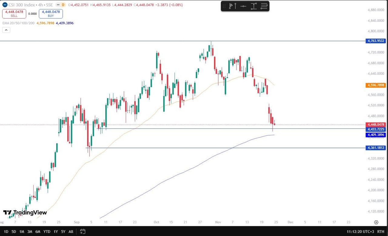 CSI 300 Китайский индекс CSI300 протестировал уровень поддержки в 4433,7 п. Следующей зоной поддержкой может стать в 4361,2 п.