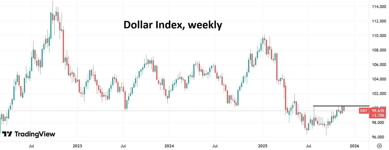 В четверг биржи и банки США были закрыты в связи с Днем благодарения. Традиционно это сокращает ликвидность и снижает ценовые колебания на валютном рынке. Сбой на CME Group приостановил торги рядом валютных пар на ее платформе, что еще больше снизило ликвидность в конце недели. Этим утром DXY торгуется возле 99,63, то есть немного выше, чем сутки ранее. На этой неделе DXY показывает просадку на 0,58%. Пара EUR/USD (1,158) в пятницу слегка корректирует тот подъем, который был на протяжении четырех последних сессий. Курс британского фунта показывает схожую картину: пара GBP/USD (1,322) отошла немного ниже уровней недельных максимумов. Японская иена в последние дни консолидируется в районе 156,2 к доллару. Китайский юань в пятницу прекратил укрепление и пара USD/CNY сейчас торгуется возле 7,078 – у минимумов с октября 2024 г. В пятницу в США будет раннее закрытие биржевых торгов в связи с Днем благодарения. Всю первую половину этой недели доллар США демонстрировал снижение, поскольку инвесторы пересмотрели ожидания по смягчению денежно-кредитной политики ФРС в основном на фоне не слишком сильных данных по американской экономике. Поскольку торгов в США вчера не было, все новости на валютный рынок приходили со стороны Европы. Согласно протоколу последнего заседания ЕЦБ (29–30 октября), члены правления европейского регулятора согласились, что сохранение процентных ставок без изменений остается целесообразным в условиях повышенной экономической неопределенности. Некоторые члены даже предположили, что дополнительное смягчение может не потребоваться и ставку по депозитам в 2% следует рассматривать как «достаточно устойчивую» для управления потенциальными рисками. Таким образом, руководство ЕЦБ подтвердило, что цикл снижения ставок в еврозоне, возможно, уже достиг своей конечной точки, если сохранятся текущие благоприятные условия. В такой ситуации участники рынка ожидают, что процентные ставки в еврозоне останутся неизменными до конца 2026 года. При этом вероятность снижения ставки ФРС в декабре на 0,25% на этой неделе подскочила до 85%. В пятницу инвесторы ожидают выхода данных по инфляции в крупнейших экономиках Европы – это необходимо для более четкого понимания тренда в монетарной политике ЕЦБ. Мы полагаем, что сюрпризов здесь ждать пока не стоит, поскольку вялые показатели потребительской активности предполагают и низкую динамику инфляции. Согласно данным Еврокомиссии, общий индекс деловых настроений в еврозоне в ноябре немного вырос до 97,0 п. против 96,8 п. месяцем ранее (ожидалось: 97,0). Индекс доверия в промышленности еврозоны снизился в ноябре до -9,3 п. с октябрьского уровня -8,5, хотя прогнозировалось -8,0. Доверие к сфере услуг в еврозоне выросло на 1,5 пункта до 5,7, что является самым высоким показателем с октября 2024 года. Однако при этом инфляционные ожидания пока остаются повышенными: 23,1 против 21,9 месяцем ранее. Объём банковского кредитования домохозяйств в еврозоне вырос в октябре на 2,8% в годовом исчислении, достигнув 7,07 трлн евро - это самый быстрый рост с марта 2023 г. (ожидалось повышение на 2,6%). Восстановлению спроса на кредиты способствовало недавнее снижение ставок от ЕЦБ. Индикатор потребительского климата Германии GfK вырос к декабрю до -23,2 п. с уровня -24,1 п. в предыдущем месяце, что соответствовало ожиданиям рынка. Потребительские настроения сейчас практ
