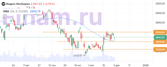 Российский рынок акций начал день со снижения на 0,8%, а в дальнейшем демонстрировал боковую динамику вблизи отметки 2640 пунктов. Причиной апатии стало отсутствие прогресса по итогам встречи президента РФ Владимира Путина со спецпосланником президента США Стивом Уиткоффом. Вопреки ожиданиям, переговоры не привели к прорывным договоренностям по урегулированию ситуации на Украине: стороны подтвердили сохранение разногласий, в частности по наиболее острым территориальным вопросам. На этом фоне инвесторы предпочли зафиксировать прибыль после прошлых попыток роста и переключились на выжидательную позицию в преддверии публикации свежих инфляционных данных и возможных новых заявлений со стороны США и Евросоюза. Геополитическая неопределенность усугубилась комментариями официальных лиц: помощник президента РФ Юрий Ушаков подтвердил отсутствие компромисса по ключевым позициям. США также воздержались от детализации. На корпоративном фронте внимание участников торгов привлекла отчетность «Мечела». Компания сообщила о приостановке работы метизного завода в Карелии на фоне финансовых трудностей, а также о снижении добычи угля в III квартале 2025 года на 16% (кв/кв) и на 38% за девять месяцев (г/г). По итогам I полугодия 2025 года «Мечел» получил чистый убыток по МСФО в размере 40,5 млрд руб. против 15,9 млрд руб. убытка годом ранее. Основными проблемами для компании остаются низкие цены на уголь и высокая долговая нагрузка, которую «Мечел» пытается реструктурировать с помощью банков и госпрограмм поддержки отрасли. Эти негативные факторы оказали дополнительное давление на котировки компании. В аутсайдерах дня оказались бумаги: «Мечела» (-3,21%), СПБ Биржи (-3,08%), «Мечела» ап (-2,80%), «Новатэка» (-2,55%), БСП (-2,15%), МТС (-2,08%), «Позитива» (-2,03%), НЛМК (-1,95%), «Эн+ Груп» (-1,91%), «Юнипро» (-1,91%). В лидерах роста: «Россети» (+2,08%), «Россети Центр» (+1,52%), НМТП (+1,51%), «Сургутнефтегаз» (+0,85%), «Ленэнерго» ап (+0,65%), «Озон» (+0,49%), «ФосАгро» (+0,47%). Технический анализ Индекс МосБиржи Индекс МосБиржи вечером в среду консолидируется в боковике 2600-2700 пунктов. В отсутствии позитива по геополитике рынок может протестировать поддержку 2600, которая проходит чуть ниже линии 50-дневной скользящей средней.