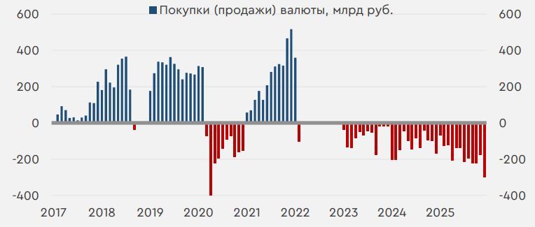 В среду Минфин объявил, что в декабре ожидается недобор нефтегазовых доходов бюджета до базового уровня в 137,6 млрд руб. Такие значения связаны не только с временно расширившимися дисконтами на российскую нефть, но и с учетом разовой выплаты демпфера за прошлый период. В результате с 5 декабря чистые продажи ЦБ увеличились с 9,04 до 14,54 млрд руб./сутки, а месячный объем операций обновил максимум с пандемии. Впрочем, данный фактор оказывает лишь временную поддержку рублю, в более долгосрочной перспективе операции по бюджетному правилу нейтральны для курса. В дальнейшем экспортерам просто предстоит уплатить меньше налогов, и в течение месяца рубль должен скорректироваться.