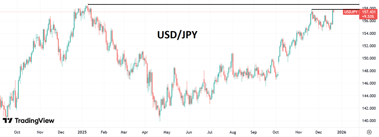 Японская иена в пятницу очень резко ослабла по отношению к доллару и другим основным валютам после того, как Банк Японии повысил ставки до 30-летнего максимума, но не дал ясности относительно будущих повышений ставки. В свою очередь курс доллара в конце прошлой недели поддержали комментарии главы ФРБ Нью-Йорка Джона Уильямса, поскольку он заявил, что некоторые из наблюдаемых данных «довольно обнадеживают» и что он не видит признаков резкого ухудшения данных по занятости. Он полагает, что рост ВВП США в этом году составит 1,5–1,75%, с последующим ускорением в следующем году, поэтому «сейчас нет необходимости срочно принимать дальнейшие меры в области денежно-кредитной политики, потому что, проведенные сокращения ставки обеспечили очень хорошие позиции». На этом фоне рыночные ожидания того, что ФедРезерв снизит свою ключевую ставку на заседании FOMC 27–28 января уменьшились до 20% против 25% неделей ранее. Однако сильная динамика американского рынка акций в конце прошлой недели и неожиданный пересмотр в худшую сторону индекса потребительских настроений США за декабрь сдерживали спрос на доллар. Ожидания новых снижений ставок ФРС в следующем году является бычьим фактором для большинства драгоценных металлов. Цена золота в начале этой недели растет на 1,72%, а котировки переписали исторические максимумы, поднявшись до $4414/унц. Серебро в этом году подскочило в цене на невиданные 120% до $69,4/унц. Пятничные данные по США показали, что продажи на вторичном рынке жилья в ноябре 2025 года выросли на 0,5% по сравнению с предыдущим месяцем и составили 4,13 млн. Ожидалось 4,2 млн. Продажи жилья на вторичном рынке растут третий месяц подряд из-за снижения ставок по ипотечным кредитам этой осенью. По уточненным данным Мичиганского университета, индекс потребительских настроений в США в декабре был пересмотрен в сторону понижения до 52,9 п. с предварительного значения 53,3 п. Опубликованный в пятницу индекс потребительского климата Германии от GfK снизился к январю до -26,9 с уровня -23,4 в предыдущем периоде, не оправдав рыночных прогнозов в -23,2 и достигнув самого низкого уровня с апреля 2024 г. Снижение отражает рост осторожности домохозяйств, при том, что склонность к сбережениям подскочила в Германии до самого высокого уровня с июня 2008 г. Слабая ситуация в экономике Германии сдерживает рост евро В понедельник курс иены к доллару стабилизировался в районе 157,4. Наибольший дневной урон иена получила в пятницу, даже несмотря на то, что Банк Японии повысил ключевую ставку на 0,25%, доведя ее до 0,75% - это самый высокий уровень с сентября 1995 г. Это означает постепенный отход БЯ от ультрамягкой монетарной политики. Потери японской валюты начались после пресс-конференции главы Банка Японии Кадзуо Уэды по итогам заседания, поскольку он не дал понимания относительно сроков и темпов будущих повышений ставок, указав лишь, что тема дальнейшего ужесточения денежно-кредитной политики пока не закрыта. Оценки того где ставка Банка Японии может быть достаточно широки: от 1% до 2,5% на фоне инфляции в стране около 3% за последние несколько лет. Но мы видим, что БЯ пока может повышать ставку темпом не более 50 б.п за год. На прошлой неделе пара USD/JPY выросла на 1,3%, несмотря на то, что в первой половине недели она снижалась. Ключевые потери иена получила в пятницу, когда ее курс к доллару быстро осл