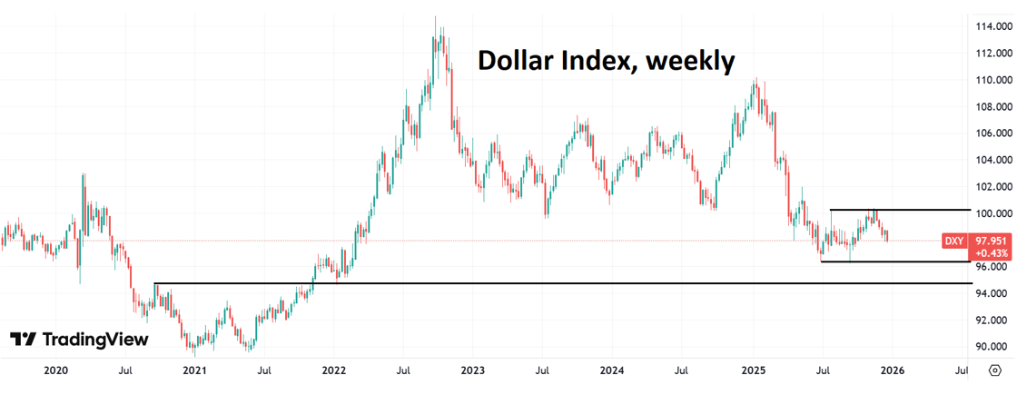 25-го декабря отмечается католическое Рождество. Закрыты биржи США, Великобритании, Германии, Франции, Австралии, Гонконга и других западных стран. Поэтому валютный рынок застыл на уровнях закрытия среды и торговая активность до конца недели будет низкой. К Рождеству индекс доллара опустился до отметки 97,95. Это означает, что курс доллара США в этом году ослаб на 9,7%. Это его самые значительные годовые потери за последние 8 лет. Но при этом, под конец года американские фондовые индексы S&P-500 и Dow Jones достигли рекордных максимумов. Индекс Nasdaq пока остается немного в тени, поскольку технологические гиганты показали недостаточно сильные результаты, а также сохраняются опасения по поводу их преувеличенных капитальных затрат на ИИ. Такое расхождение в динамике доллара и фондового рынка США не парадокс, а результат того, что курс валюты и рынок акций реагируют на разные, пусть и пересекающиеся факторы. Доллар в основном отражает денежно‑кредитные и процентные дифференциалы, поток капитала и оценки инфляции; а акции — ожидания корпоративных прибылей, денежной ликвидности, дисконтирования будущих денежных потоков и настроения инвесторов. Ослабление доллара также может рассматриваться, как смягчение финансовых условий для бизнеса по крайней мере для экспортеров. Курс евро к Рождеству торгуется возле отметки 1,18 – это близко к самым высоким уровням за этот год. Неделей ранее ЕЦБ сохранил свои процентные ставки без изменений и дал понять, что ставки останутся на текущем уровне еще некоторое время. При этом ЕЦБ сейчас прогнозирует рост экономики еврозоны на уровне 1,4% в 2025 году, по сравнению с предыдущей оценкой в 1,2%. В это же время, нестабильная ситуация на рынке труда США и снижающиеся показатели инфляции создают ожидания того, что ФРС продолжит снижать свои ставки в следующем году. Эти факторы сейчас являются определяющими для сохранения силы курса пары EUR/USD. Доллар пережил бурный год: основные его потери пришлись на первую половину из-за хаотичных торговых тарифов и жесткого настроя к своим партнерам президента Д. Трампа. Это спровоцировало кризис доверия к американским активам и валюте весной этого года. Растущее давление администрации Белого Дома на ФРС также вызывает опасения по поводу ее независимости и не способствует укреплению доллара. Есть высокие ожидания того, что тенденция на ослабление курса доллара сохраниться и в 2026 году, поскольку цикл снижения ставок ФРС еще пока не закончен, в то время как другие Центробанки мира видимо будет держать свои ставки стабильными или даже будут их повышать (Банк Японии). Главный экономист Goldman Sachs по США Дэвид Мерикл заявил на этой неделе: «Мы ожидаем, что FOMC пойдет на компромисс по поводу еще двух снижений ставки на 25 б.п. до 3-3,25%, сославшись на замедление инфляции, как на причину такого прогноза. Опубликованные днем ранее сильные данные по динамике ВВП США за 3-й квартал слегка изменили прогноз ФРС о снижении процентных ставок. На утро четверга рыночная вероятность снижения ставки ФРС в январе на 0,25 п.п. составляла около 15% против 25% неделей ранее. В среду вышли данные, показавшие, что первичные заявки на пособие по безработице в США снизились на 10 тыс по сравнению с предыдущей неделей, составив 214 тыс, что совпадает с обычно нестабильным сезоном праздников для новых заявок. Это значительно 