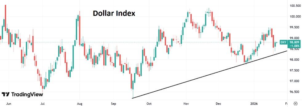 Вечером в среду индекс доллара смог восстановить часть понесенных потерь, американский рынок акций вырос, а золото отошло от вчерашних максимумов. Мировые рынки вздохнули с облегчением после того, как Д. Трамп в среду отказался от угроз введения пошлин против Европы и исключил применение военной силы в вопросе Гренландии. Это снизило опасения по поводу новой торговой и геополитической эскалации. К утру четверга DXY смог восстановиться до 98,8. На этом фоне пара EUR/USD скорректировалась до 1,168 с недельного максимума на 1,177. Курс британского фунта за последние сутки сильно не менял своих позиций, оставаясь возле 1,343. Восстановление доллара привело к тому, что пара USD/JPY (158,8) опять стала разворачиваться в сторону годовых максимумов. Китайский юань за последние три сессии ведет себя стабильно к доллару: пара USD/CNY торгуется сейчас возле 6,963. В середине недели индекс доллара развернулся наверх поскольку инвесторы позитивно оценили выступление Д. Трампа на Всемирном экономическом форуме в Давосе. Американский президент в свойственной ему манере, ранее начал жестко давить на Европу, чтобы добиться приобретения Гренландии. Угрозы введения новых повышенных тарифов против ряда ведущих стран ЕС значительно испугали инвесторов в начале этой недели. Распродажа больно ударила по курсу доллара, казначейских облигаций США и американских акций. Власти Дании отказались обсуждать с США возможность переговоров о передаче (продаже) Гренландии. ЕС вчера принял решение о бессрочном замораживании торгового соглашения с Соединёнными Штатами. Соглашение, достигнутое сторонами прошлым летом после периода торговой напряжённости, которое требовало формальной ратификации Европейским парламентом, было отложено на неопределённый срок. Видя такую сплоченность европейских стран Д. Трамп вчера, как обычно, сделал шаг назад, исключив возможность захвата арктического острова силой. Он также сообщил, что переговоры с ЕС продолжаются, в том числе по вопросу проекта «Золотой купол», из-за реализации которого обострилась тема Гренландии. В свою очередь Дания сообщила, что может передать в собственность США участки Гренландии для строительства военных баз, чтобы избежать аннексии всего острова. В итоге рынки восприняли все эти новости, как сигнал снижения напряженности и возврата к позитивным ожиданиям. Поэтому спрос на защитные активы ослаб: золото подешевело, цены на рынке гособлигаций стабилизировались, а курс доллара примерно на треть восстановил те позиции, которые он утратил за понедельник и вторник. Однако геополитическая напряженность остается повышенной. Пока не будет заключено взаимоприемлемое соглашение с Данией по Гренландии, спрос на защитные активы и валюты сохранится. Инвесторы понимают, что в трансатлантическом альянсе США и ЕС уже пробежали трещины. И пока Д. Трамп будет у власти периодически будут возникать все новые темы для трений. В СМИ все чаще обсуждается, что эпоха послевоенного мироустройства, основанная на военном и экономическом союзе западных демократий, на втором сроке Д. Трампа стала сворачиваться, уступая место прямым силовым акциям. Даже в республиканской партии США стали все громче звучать голоса против агрессивной кампании, проводимой сейчас Белым Домом. Аналитики банка Morgan Stanley отмечают, что политика президента США 