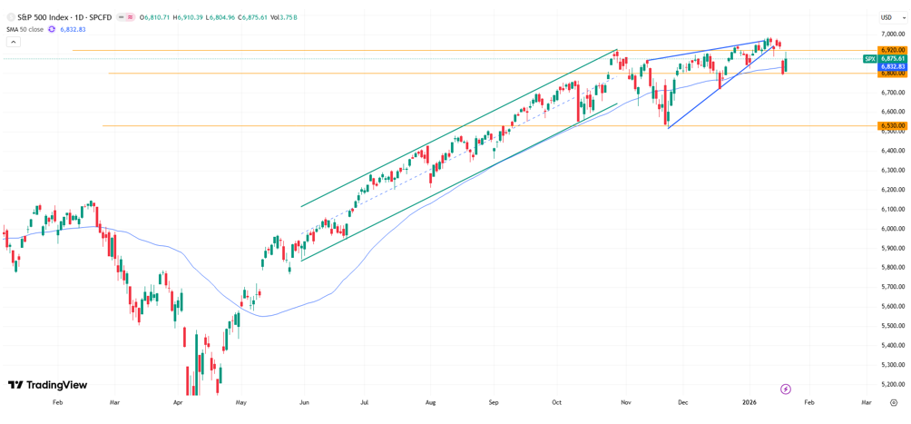 S&P 500 Индекс S&P 500 на дневном графике отскочил от поддержки на уровне 6800 и закрепился в районе 6876. Пробой сопротивления на отметке 6920 станет сигналом к возобновлению восходящего движения и открывает путь к ретесту исторических максимумов.