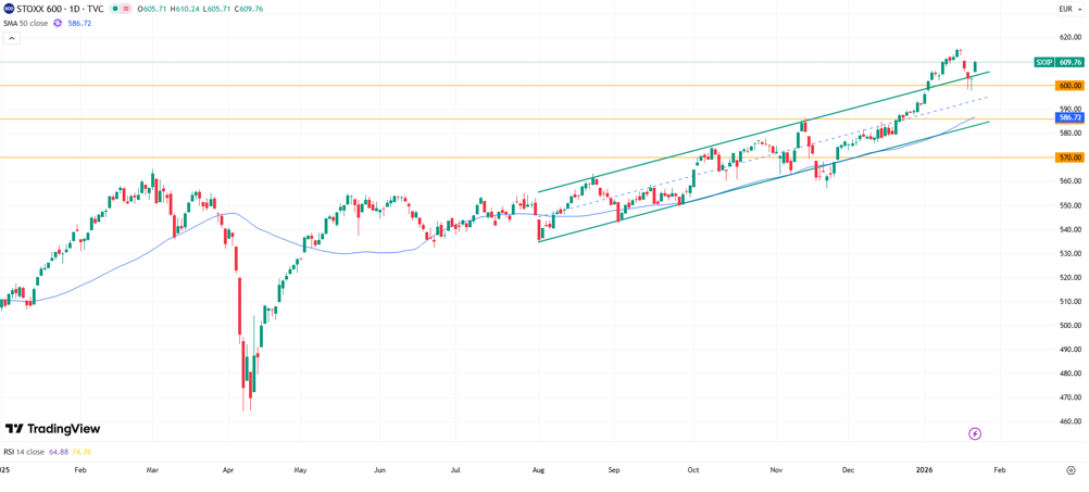 Euro STOXX 600 Индекс STOXX 600 торгуется на уровне 610 пунктов, выше восходящего ценового канала, в котором бенчмарк двигался с августа 2025 года. Ближайшая поддержка индексу в случае коррекции расположена на 600 пунктах.