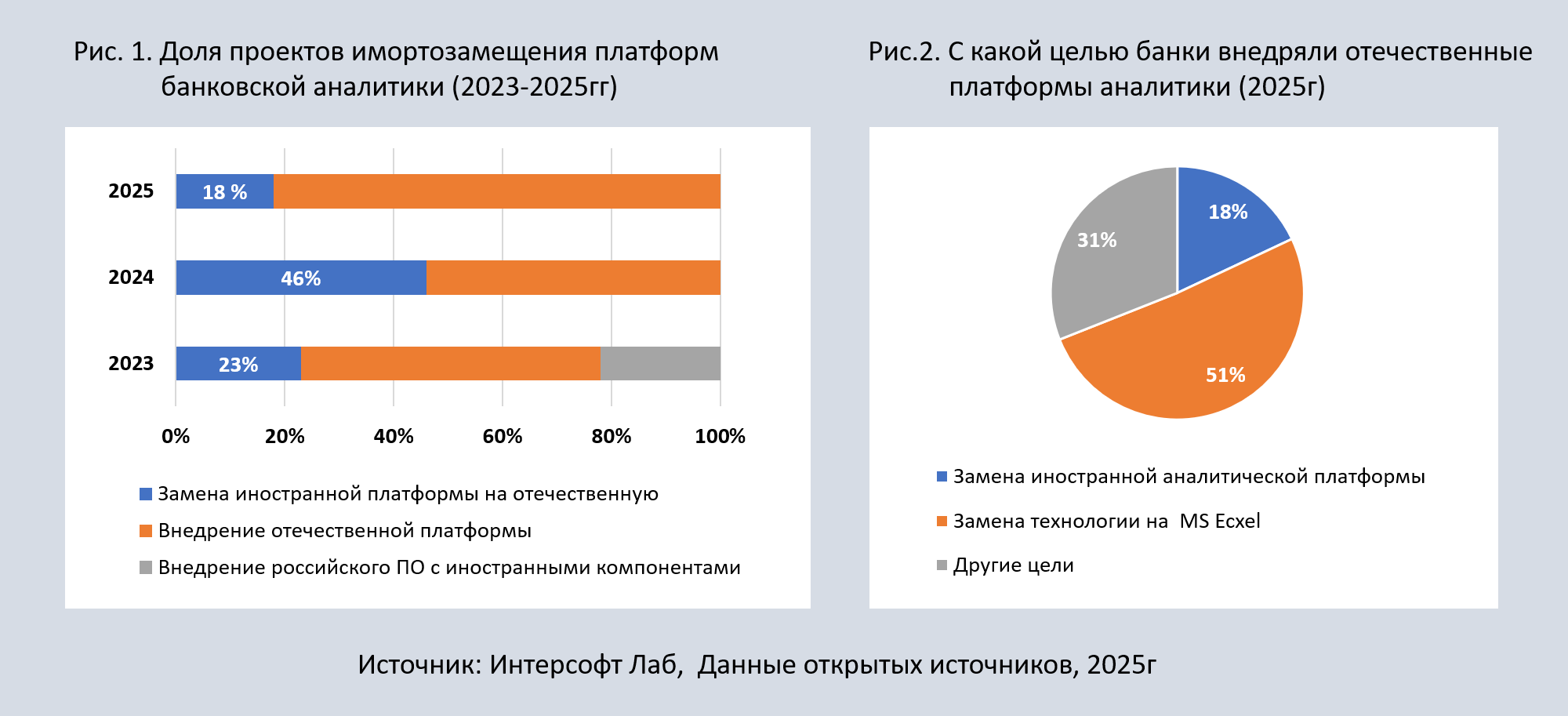 Темпы перехода банков на отечественные платформы хранилищ данных и системы управления эффективностью замедлились. Финансовые организации запустили вдвое меньше проектов, чем годом ранее. Внедряли системы в основном средние по размеру активов банки с целью автоматизации регуляторной и управленческой отчетности, аллокации расходов. Рынок банковской аналитики не оправдал прогнозов на 2025 год. Вместо ожидаемого роста после динамичного 2024 года и бодрого старта проектов импортозамещения рынок начал охлаждаться. Финансовые организации запустили вдвое меньше проектов внедрения отечественных платформ для построения корпоративных хранилищ данных (сокращ. ХД) и систем управления эффективностью. Об этом свидетельствуют результаты экспресс-анализа рынка, проведенного «Интeрсофт Лаб» по данным открытых источников. Главной причиной спада рыночной активности стало замедление процессов замены иностранного аналитического ПО на отечественные аналоги. Банки временно отложили модернизацию систем, не относящихся к объектам КИИ, до завершения миграции на российские АБС. Негативно повлияли на отказ от зарубежного софта и возникшие в начале года надежды на ослабление санкционного давления. В результате доля проектов импортозамещения аналитических платформ в банках снизилась. Если в 2024 году с этой целью было выполнено 46% внедрений отечественного ПО, то в 2025м реализовано только 18 % таких проектов (см. Рис.1). Более активно банки осваивали отечественные платформы, чтобы реализовать задачи цифровизации и прекратить использование нетехнологичных решений на иностранном табличном редакторе. В половине проектов специализированная система пришла на смену Excel-решениям для подготовки банковской отчетности (см. Рис.2).