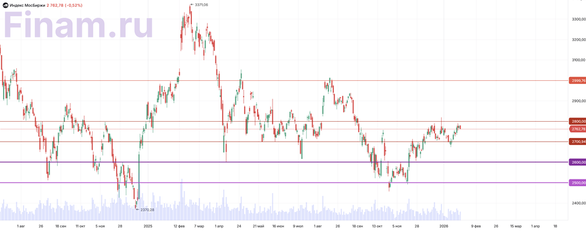 Сегодня, 26 января 2026 г., Индекс МосБиржи снижается после роста на прошлой неделе и выходных сессий на фоне переговоров, прошедших в ОАЭ. По итогам пятничных торгов индекс находился в плюсе, однако отсутствие явных результатов переговоров заставило инвесторов скорректировать свои ожидания сегодня. Российская сторона отмечает, что по итогам раунда «конкретных сподвижек» не зафиксировано — официальные комментарии указывают на то, что вопросов еще много и прямого прорыва не произошло, хотя диалог возобновляется и это воспринимается как позитивный сигнал. Рынок будет ждать продолжения переговоров ближе к концу этой недели, пока что сигнал для рынка нейтрально-негативный, так как по заявлению Д. Пескова «прорыва ждать не стоит». Сильно давит на российский рынок новости из макро поля. По данным ЦБ ценовые ожидания бизнеса увеличиваются четвертый месяц подряд и остаются повышенными, а незаякоренные инфляционные ожидания заставляют ЦБ учесть этот фактор в проводимой ДКП. Это снижает вероятность быстрого снижения ключевой ставки. Негативно сказывается на российском рынке снижение нефти. Сегодня котировки Brent упали на 0,52% до $64,76. Курс доллара к рублю, установленный ЦБ, вырос до 76,01 руб./дол. По итогам основной сессии Индекс МосБиржи упал на 0,52% до 2762,78 пункта, индекс РТС упал на 0,63% до 1145,03 пункта. Лидерами роста стали бумаги «Селигдар» (+7,27%), «Русал» (+3,84%), «Новабев Групп» (+2,66%), «Норникель» (+2,07%). Лидерами снижения завершили сессию бумаги «Новатэк» (-2,07%), «Лукойл» (-2,45%), «Магнит» (-2,08%), «АФК Система» (-1,95%). «Финуслуги»: средняя ставка по годовому вкладу в крупных банках опустилась ниже 13%. «Аэрофлот» из-за сбоя в системе бронирования Leonardo временно ограничил регистрацию пассажиров и багажа, оформление билетов. Скидки на российскую нефть марки Urals по отношению к Brent выросли до максимума с 2022 года на фоне санкций — Reuters. «Норникель» столкнулся с задержкой в строительстве медеплавильного завода на южном побережье Китая после того, как его местный партнер вышел из проекта — Bloomberg. Ралли в металлах продолжается: серебро растет на 9,7% до исторического рекорда в $111, золото растет на 2,2% до $5130, палладий прибавляет 6,5% до $2150. Инвесторам, интересующимся российским рынком акций, мы по традиции рекомендуем обратить внимание на стратегию «RU. Капитал и дивиденды». Техническая картина Индекс МосБиржи Индекс МосБиржи на дневном графике на фоне политически событий снова развернулся вниз вблизи уровня 2800 пунктов, на выходных сессиях в моменте индекс доходил до 2796 пунктов, но не смог его пробить из-за крепкости данного уровня. Такой уровень сопротивления может быть пробит только на фоне однозначного позитива в геополитике. В ближайшие сессии возможен откат до 2700 пунктов в рамках бокового канала 2700 – 2800 пунктов.