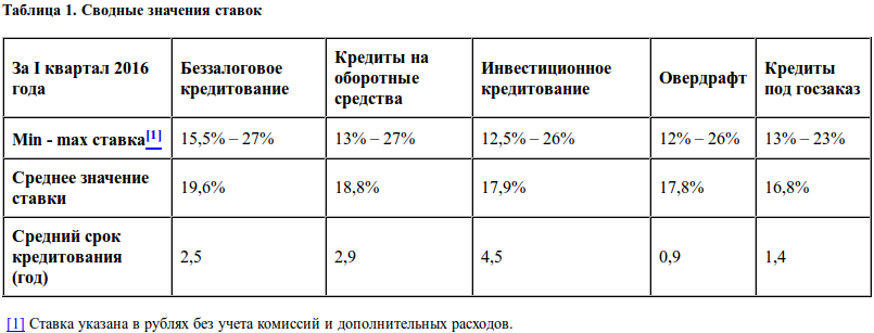 Аналитики МСП Банка по результатам исследования «Основные условия финансирования МСП лидирующими банками (I кв. 2016 г.)» зафиксировали снижение среднего значения кредитной ставки по продуктам для МСП на 2,6 п.п. до 18,1% в I квартале 2016 года, по сравнению с аналогичным периодом 2015 года. При этом по отношению к IV кварталу 2015 года ставка выросла на незначительные 0,1%. Значения ставок варьировались от 12% до 27% годовых. Данные были получены в результате изучения кредитных продуктов 30 банков, входящих в ТОП-100 банков России по размеру активов. В ходе мониторинга кредитных продуктов банков было выявлено, что банковские комиссии приводят к удорожанию кредитов МСП дополнительно на 0,3 – 2,5% годовых, а средний размер комиссий составил порядка 1,3%. «Мониторинг ставок ряда крупнейших банков показал плавное снижение среднего показателя кредитной ставки для МСП в 2015 году и стабилизацию его в начале 2016 года на уровне 18% годовых. Мы ожидаем, что во II квартале 2016 года ставка сохранится на этом же уровне или может незначительно снизится», – отметил заместитель руководителя Аналитического центра МСП Банка Александр Шамрай.