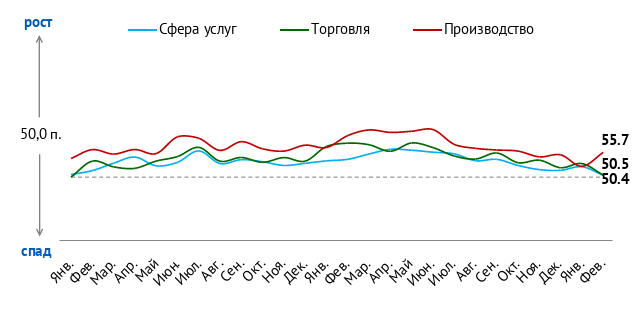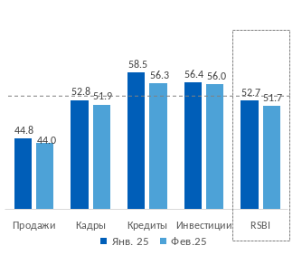 Источник: ПСБ Аналитика & Стратегия, Magram Market Research, НАФИ Индекс RSBI по видам деятельности В феврале среди отраслей динамика также была разнонаправленной: в сфере производства — рост, в то время как в торговле и услугах наблюдался спад. RSBI в сфере производства вырос до 55,7 пункта (+3,2 п.п.). Основными драйверами выступили Продажи (+6,3 п.п.) и Инвестиции (+4 п.п.). Положительную динамику также продемонстрировали показатели Кадров (+1,4 п.п.) и Кредитов (+0,4 п.п.). Показатель деловой активности в сфере торговли снизился до 50,5 пункта (-2,6 п.п.), отражая слабый рост. Спад продемонстрировали Продажи (-4,8 п.п.), Кадры (-3,7 п.п.) и Инвестиции (-2,3 п.п.), а вот компонента Кредиты подросла (+0,4 п.п.). Значение индекса RSBI в сфере услуг составило 50,4 пункта (-2,0 п.п.). Снижение показателей характерно почти для всех компонент, кроме Кадров (+0,7 п.п.). Индекс RSBI по видам деятельности