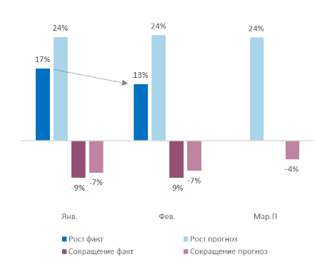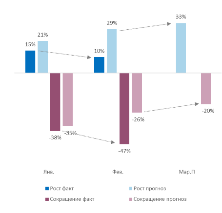Источник: ПСБ Аналитика & Стратегия, НАФИ, Magram Market Research Компонента Кадры снизилась на 0,9 п.п. до 51,9 пункта, достигнув минимума с февраля 2023 года. Наблюдается незначительный рост в фактическом найме — 10% компаний увеличили штат сотрудников (+1 п.п.). Сокращения при этом остались на том же уровне — у 20% МСП. В феврале амбициозность МСП относительно кадровой активности по сравнению с январем снизилась — расширять штат планируют 24% предпринимателей (-4 п.п.). Планы по найму сотрудников наиболее свойственны московским компаниям (30%) и представителям малого бизнеса (29%). Как и месяцем ранее, сокращений ожидают 6% компаний, при этом сильнее тенденция выражена среди предпринимателей из Санкт-Петербурга (15%). Фактические и ожидаемые изменения штата сотрудников в компаниях МСП