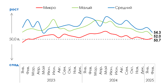 Источник: ПСБ Аналитика & Стратегия, НАФИ (Числа в графиках округлены) Индекс RSBI по размерам бизнеса В феврале RSBI малого и среднего бизнеса снизился, в то время как индекс микробизнеса выровнял положение и вернулся в зону роста. Значение индекса RSBI в микробизнесе увеличилось на 0,8 п.п. до 50,7 пункта. Подъем коснулся Продаж (+2,7 п.п.) и Инвестиций (+1,4 п.п.). RSBI в малом бизнесе упал на 2,8 п.п., до 52 пунктов. Спад отразился на всех компонентах, в первую очередь Продажах (-3,4 п.п.) и Кредитах (-3,2 п.п.). Показатель деловой активности среднего бизнеса упал до 54,3 пункта (-2,9 п.п.). Более негативное влияние на индекс оказали также компоненты Продажи (-6,5 п.п.) и Кредиты (-2,7 п.п.). Индекс RSBI по размерам бизнеса