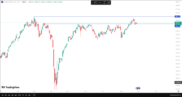 Euro STOXX 600 Европейский индекс STOXX600 демонстрирует отскок от зеркального уровня поддержки в 555,14 п. Цена, возможно, дойдет до уровня сопротивления в 565,11 п.