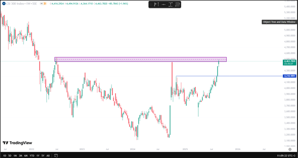 CSI 300 Китайский индекс CSI300 подошел к зоне сопротивления в 4463-4500 п. При наличие негативного новостного фона возможна коррекция до зеркального уровня в 4210,9 п.