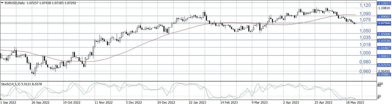 В пятницу, 26 мая, курс EUR/USD находится у уровней вчерашнего закрытия и торгуется у отметки в 1,073. Индекс доллара DXY также консолидируется у локальных максимумов торгуясь у отметки в 104,09. Доллар укрепился четвертую сессию подряд против корзины основных валют, достигнув двухмесячного максимума, поскольку данные по США указывали на устойчивость экономики даже после агрессивного цикла повышения ставок Федеральной резервной системой. Еженедельные первичные заявки на пособие по безработице выросли на 4 000 на прошлой неделе до 229 тыс., что ниже прогноза в 225 тыс., в то время как данные за предыдущую неделю были пересмотрены в сторону резкого снижения, что свидетельствует о том, что экономика не проявляет признаков спада. Вторая оценка роста ВВП за I квартал подтвердила, что экономика росла медленнее, но рост был пересмотрен в сторону увеличения до 1,3%к/к с первоначальных 1,1%к\к, хотя все еще оказался заметно ниже роста на 2,6% к/к в IV квартале 2022. На этом фоне рынки преисполнились оптимизма и теперь ожидают, что ключевые ставки не только могут остаться на рекордных уровнях еще продолжительное время, но и могут быть повышены еще на 25 б.п. на следующем заседании ФРС. Сейчас вероятность повышения ставки ФРС на 25б.п. на июньском заседании составляет около 53%, согласно данным CME's Fedwatch Tool, по сравнению с 36% в среду. Напротив, экономика Германии, крупнейшая в Европе, в первом квартале переживала спад, поскольку ВВП сократился на 0,3%к/к по сравнению со снижением на 0,5% к/к в предыдущем квартале и прогнозами в 0% к/к от аналитиков, что привело к снижению курса евро. Недавние комментарии чиновников ФРС показали, что члены ФРС разделились во мнениях относительно того, стоит ли продолжать повышать ставки или нет. Глава ФРБ Бостона Сьюзан Коллинз заявила в четверг, что, возможно, для центрального банка США настало время приостановить цикл повышения ставок, а президент ФРБ Ричмонда Том Баркин сказал, что ФРС находится в ситуации «испытания и обучения» в условиях замедления инфляции. Беспокойство по поводу возможного дефолта США оказало поддержку доллару в последнее время, поскольку в Вашингтоне продолжаются переговоры о повышении потолка долга в размере 31,4 триллиона долларов. Казначейство предупредило, что оно не сможет оплатить все свои счета 1 июня, если лимит не будет увеличен. После нескольких дней переговоров президент США Джо Байден и главный республиканец в Конгрессе Кевин Маккарти, похоже, близки к заключению соглашения о сокращении расходов и повышении лимита, при этом обе стороны расходятся примерно на 70 миллиардов долларов. Ранее агентство Fitch поместило долговые рейтинги США «ААА» под негативный контроль, что является предвестником возможного понижения рейтинга, если законодатели не смогут достичь соглашения. Кроме того, рейтинговое агентство DBRS Morningstar в четверг поставило рейтинг США на пересмотр с целью понижения. Касаемо макроэкономической статистики, вчера в США помимо вышеописанных данных по темпам роста ВВП и первичным заявкам на пособие по безработице также были опубликованы данные по индексу национальной активности от ФРБ Чикаго за апрель, которые показали результат в -0,07 пункта по сравнению с -0,37 пунктами месяцем ранее. Также стали известны предварительные данные по корпоративным прибылям за I квартал, показавшие снижение на 6,8% к/к п