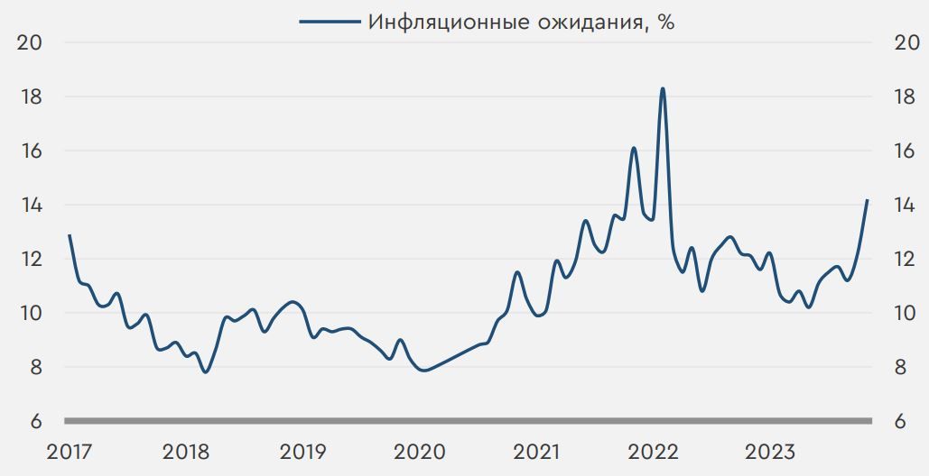 В понедельник на мировом рынке превалировали умеренно позитивные настроения. Вчерашняя статистика в развитых странах не была принципиально важной для рисковых активов. Представители ФРС вчера продолжили придерживаться жесткой риторики, подчеркивая, что инвесторы стали закладывать слишком агрессивное снижение ставки американского регулятора. Впрочем, глобальный рынок пока слабо реагирует на такие сигналы. В России вчерашний день в первую очередь отметился публикацией данных, указавших на неожиданно сильный рост инфляционных ожиданий населения в декабре (см. развернутый комментарий). При этом параметры объявленного вчера 12-го пакета санкций не предоставили принципиальных сюрпризов инвесторам. Сегодня инвесторы на мировом рынке будут оценивать ноябрьские данные по строительству и выдачам разрешений на строительство в США. Статистика даст сигналы как о состоянии экономического роста, так и о перспективах дальнейшего повышения цен на рынке недвижимости. Инвесторы в мире также продолжат следить за заявлениями представителей регуляторов и за геополитическими новостями. На российском рынке из событий вторника стоит отметить публикацию полного индикатора бизнес-климата в декабре и анонс параметров завтрашнего аукциона по размещению ОФЗ. Нефть и рубль. Цены на нефть вчера заметно выросли. Поддержку котировкам оказывали сообщения о проблемах с судоходством в Красном море, усилившие риски перебоев в поставках нефти. Сегодня фьючерсы Brent торгуются у $78/барр. Тем не менее рост нефтяных цен во вторник, вероятно, замедлится на фоне объявлений о принятии ряда мер по обеспечению безопасности судоходства в Красном море. Во второй половине понедельника рубль перешел к укреплению. Помимо глобально ослабившегося доллара, в моменте некоторую поддержку российской валюте мог оказывать существенный рост нефтяных цен. Сегодня курс USDRUB находится у 89,9 руб./$. Другие курсы валют EM с утра двигаются разнонаправленно. В текущих условиях курс USDRUB попробует на время закрепиться ниже 90 руб./$. Инфляционные ожидания в России. Вчера Банк России опубликовал краткую справку об инфляционных ожиданиях населения в декабре. Показатель на один год за месяц вырос сразу на 2 п.п. до 14,2%, обновив максимум с марта. Такой резкий рост ожиданий в первую очередь объясняется удорожанием товаров-маркеров, особенно, яиц. На этом же фоне наблюдаемая населением инфляция выросла в декабре на 1,9 п.п. до 17%, максимума с ноября 2022 года. Столь резкий рост инфляционных ожиданий грозит раскручиванием «инфляционной спирали», что может все же потребовать от ЦБ РФ дополнительное ужесточение ДКП. Тем не менее Правительство уже приняло ряд регуляторных мер для стабилизации ситуации, в том числе обеспечив поставки яиц из ряда других стран. Если эти меры окажутся эффективными, инфляционные ожидания перед февральским заседанием ЦБ могут коррекционно снизиться. Медианные инфляционные ожидания населения РФ на год